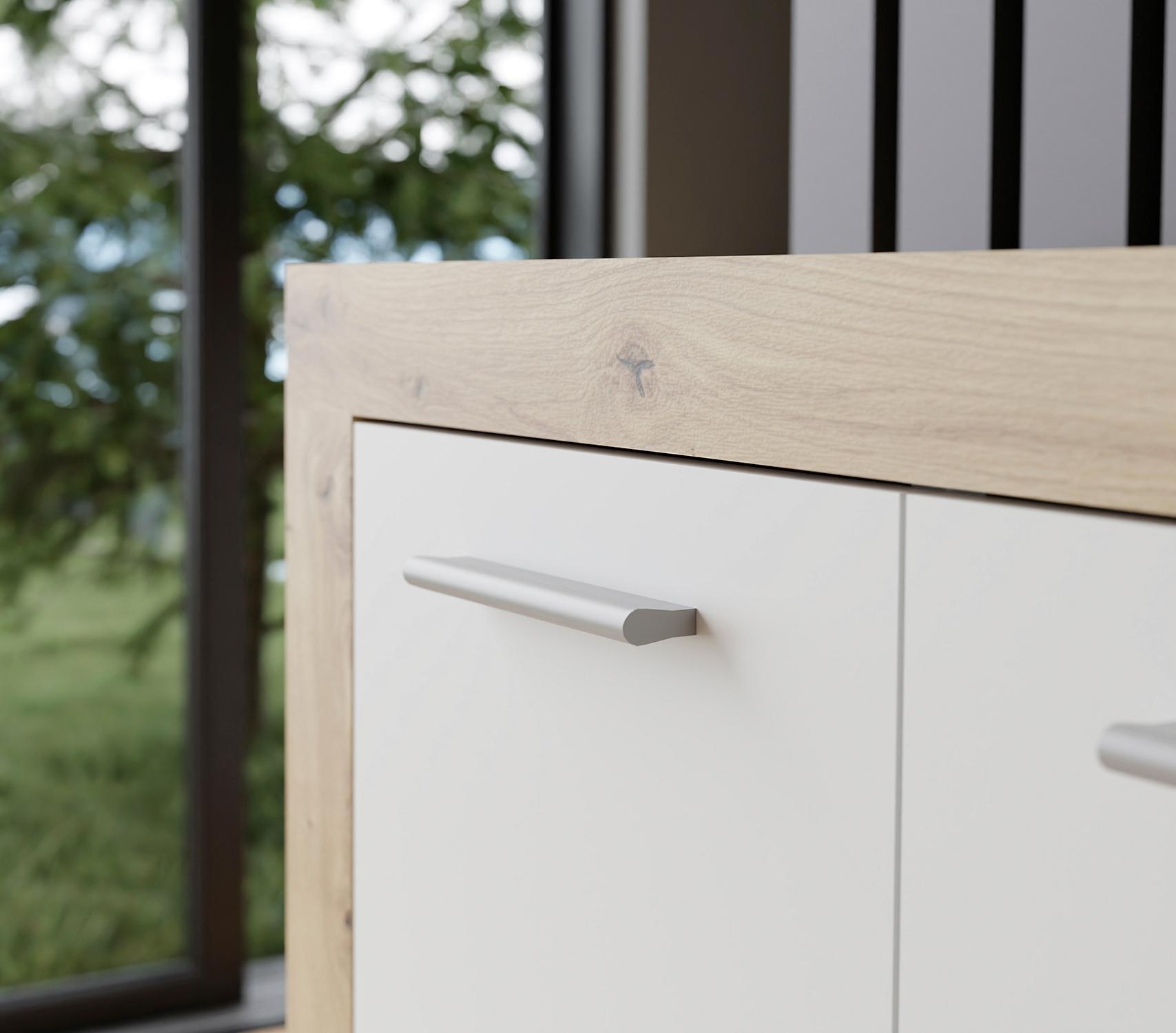 Die Kommode BIONDA ist in Artisan Eiche Dekor gefertigt und verfügt über Fronten in Weiß matt. Sie ist mit zwei Türen und zwei Schubladen ausgestattet. Hinter den Türen befindet sich ein Einlegeboden, der mehrfach höhenverstellbar ist. Die Oberplatte ist bis maximal 40 kg belastbar. Die Kommode hat eine Breite von 84 cm, eine Höhe von 92 cm und eine Tiefe von 34 cm.
