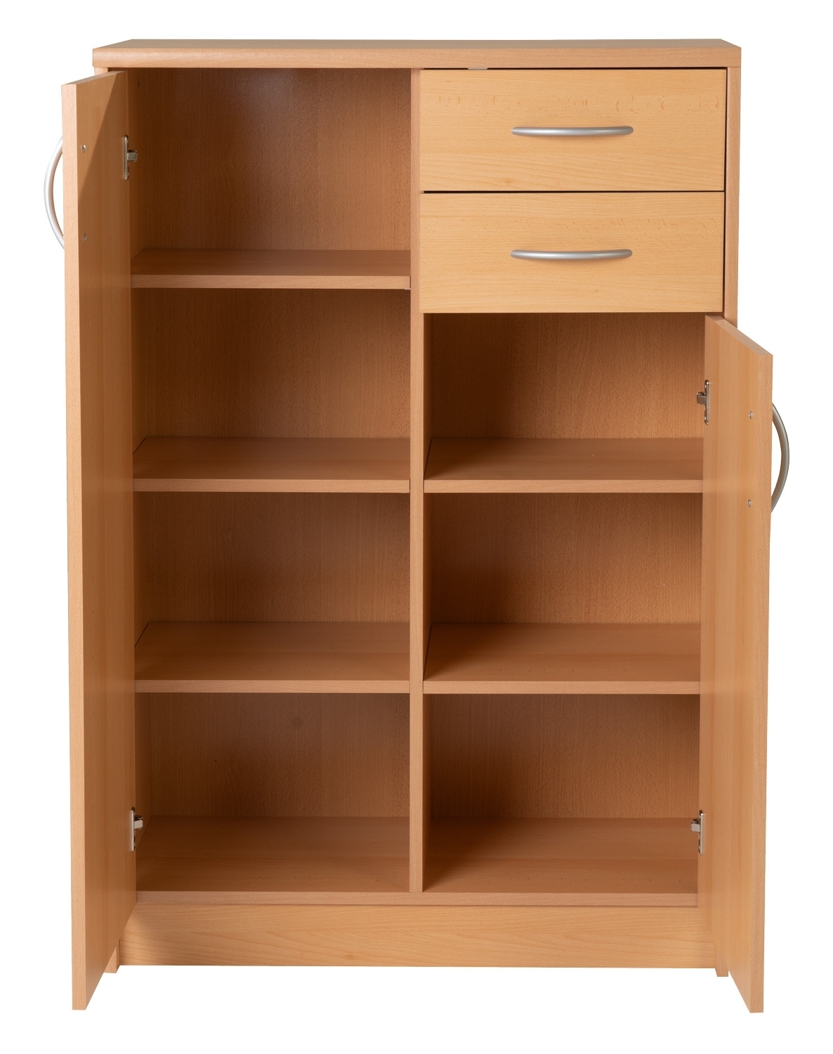 Die Kommode in Buchedekor verfügt über fünf 3-fach höhenverstellbare Einlegeböden. Dies ermöglicht eine optimale Anpassung an die jeweiligen Bedürfnisse.