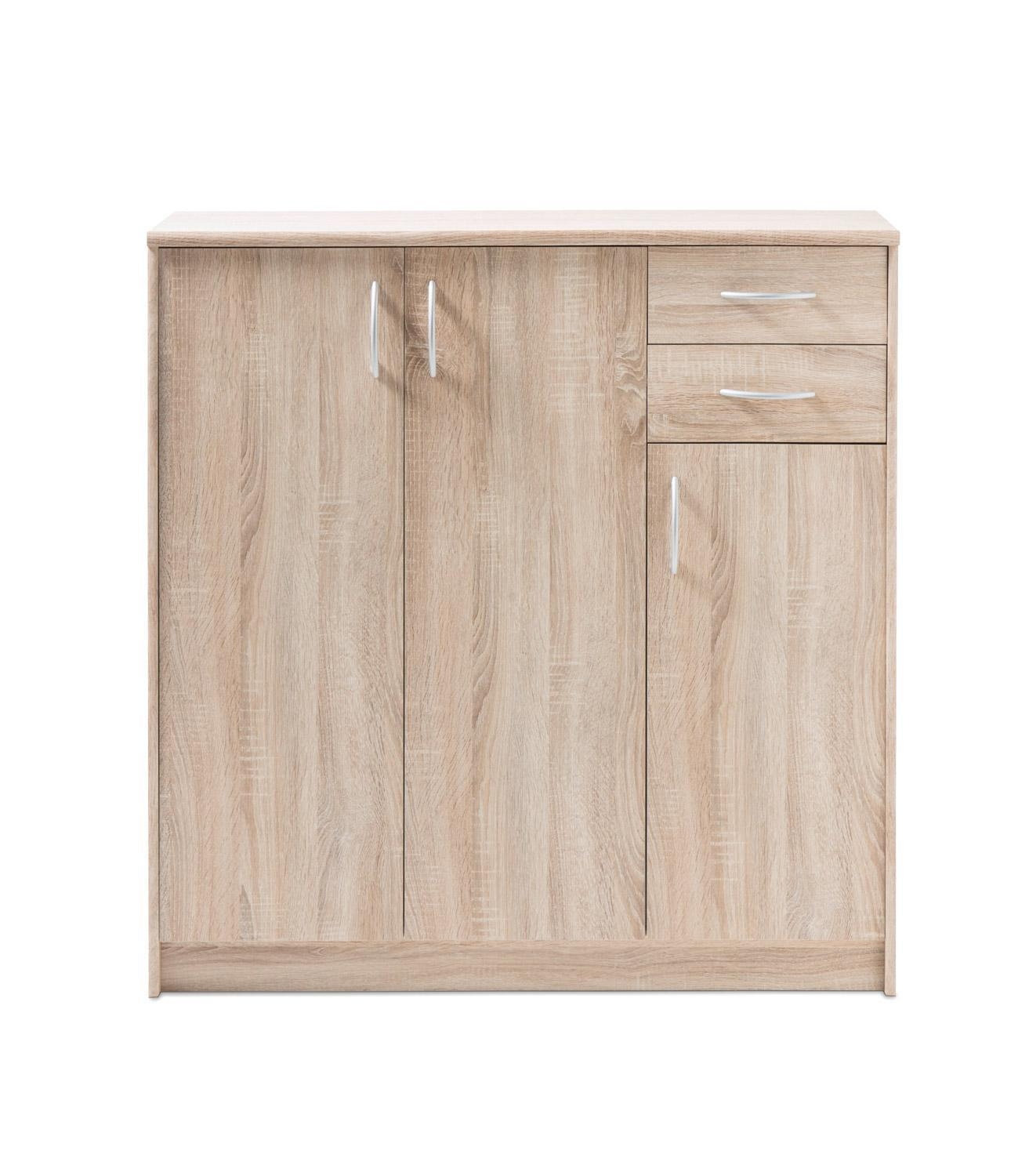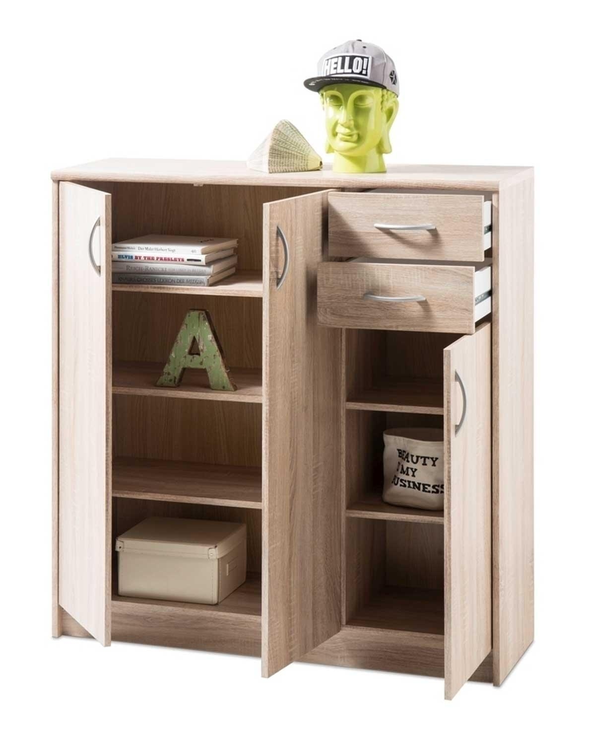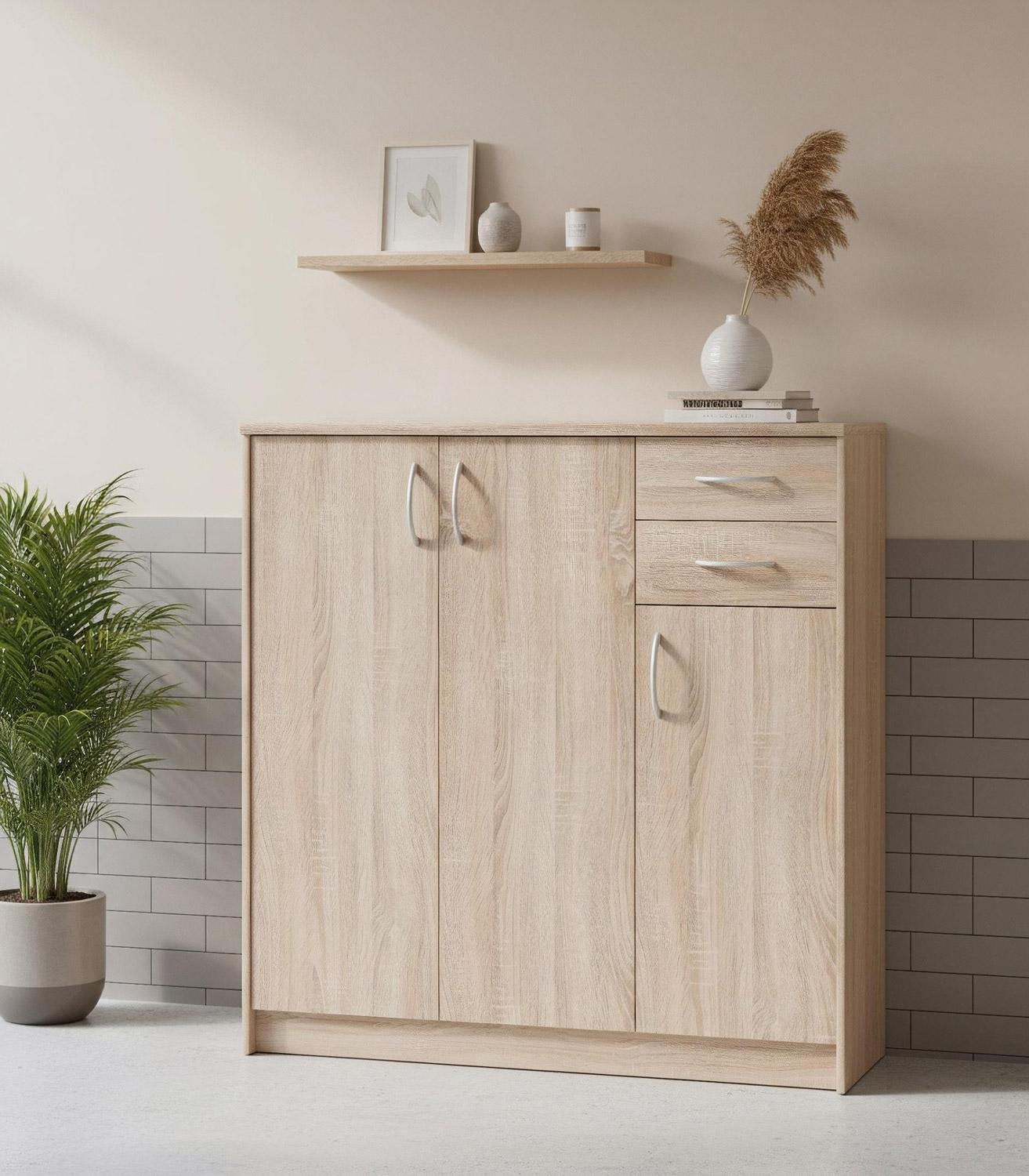 Die Kommode in Eichedekor Sonoma verfügt über fünf 3-fach höhenverstellbare Einlegeböden. Dies ermöglicht eine optimale Anpassung an die jeweiligen Bedürfnisse.