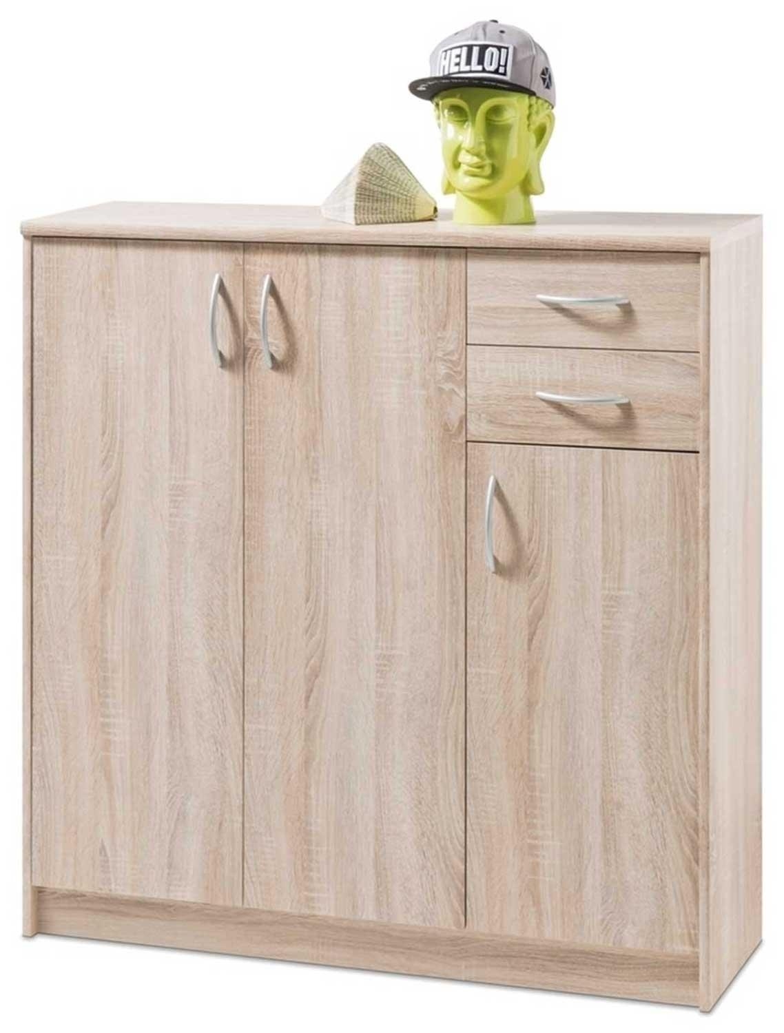 | Lieferumfang: | 1 Kommode mit 3 Türen, 2 Schubladen und 5 höhenverstellbare Einlegeböden. Alle Böden sind 3-fach in der Höhe verstellbar |