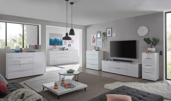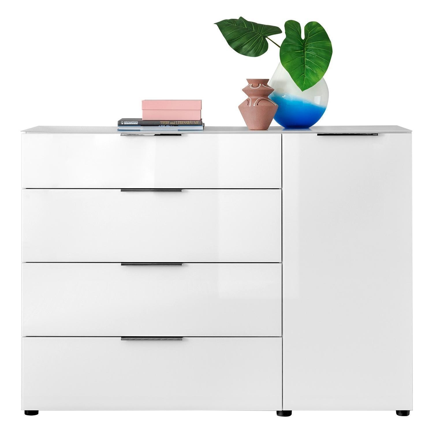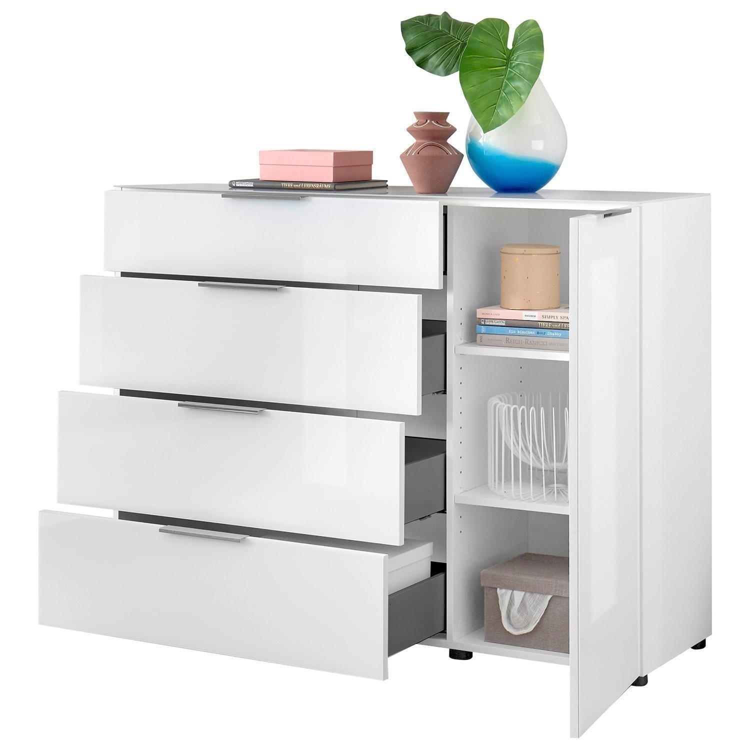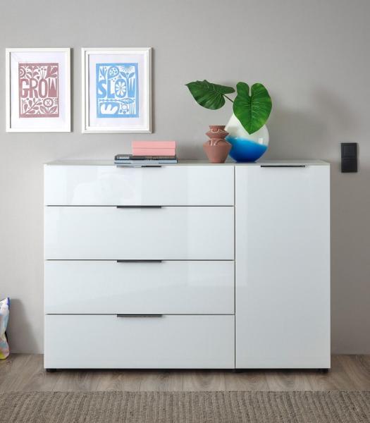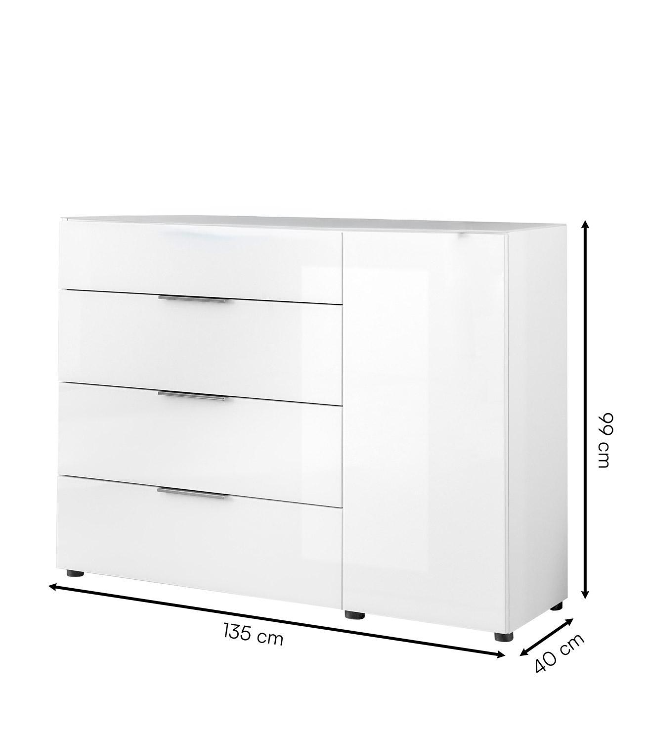 135 x 99 cm - 1 Tür - 4 Schubladen - Weißglas - Weiß matt