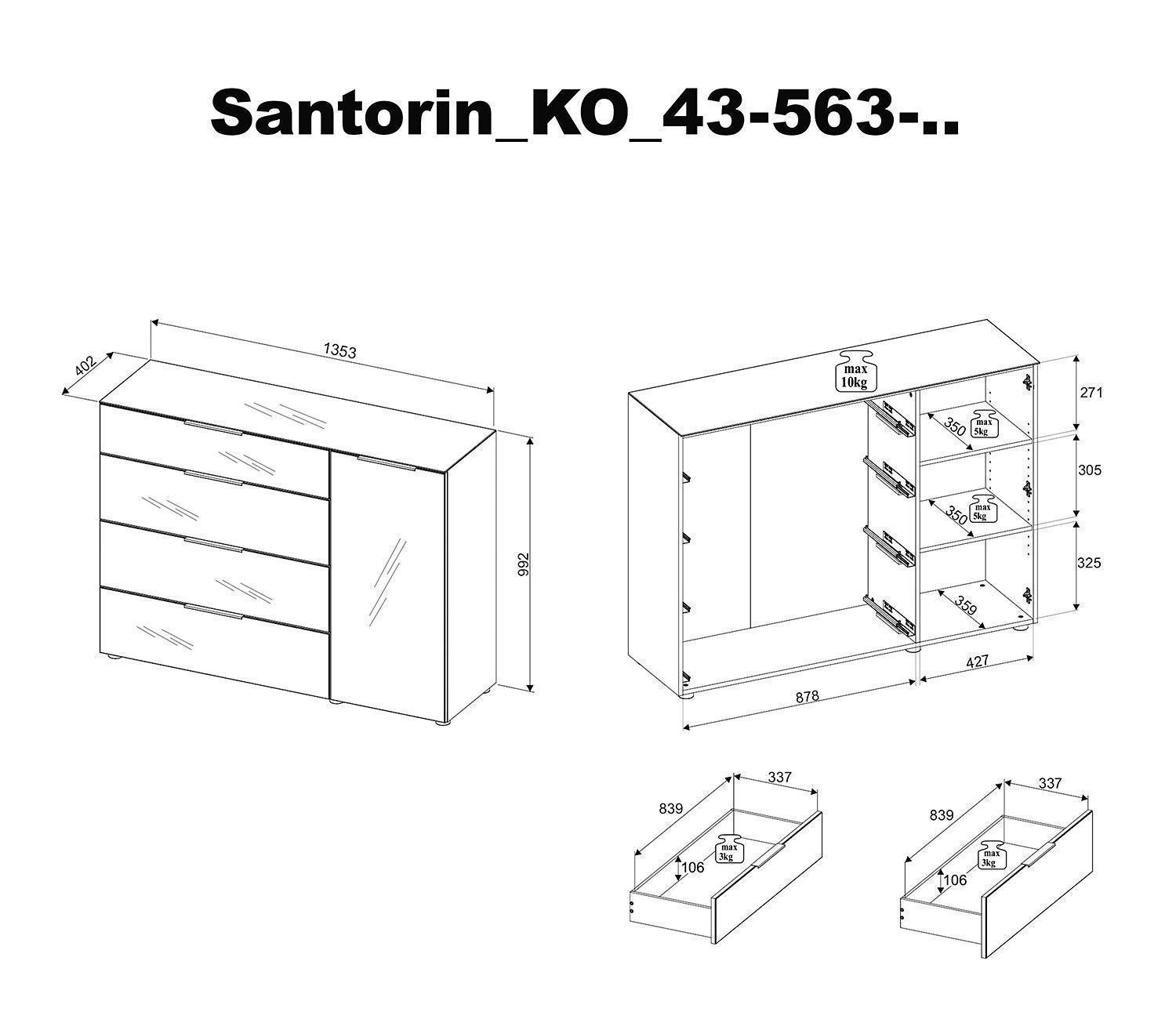 | Lieferumfang: | 1 Kommode mit 1 Tür, 4 Schubladen und 2 höhenverstellbaren Einlegeböden |