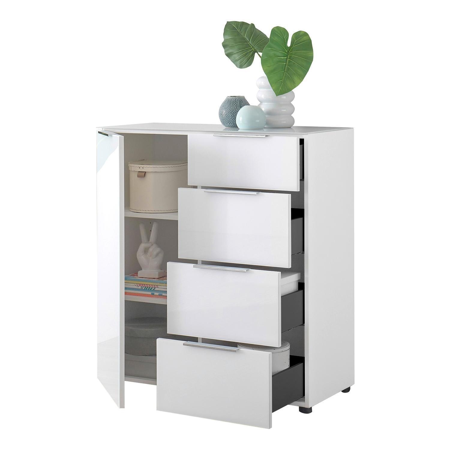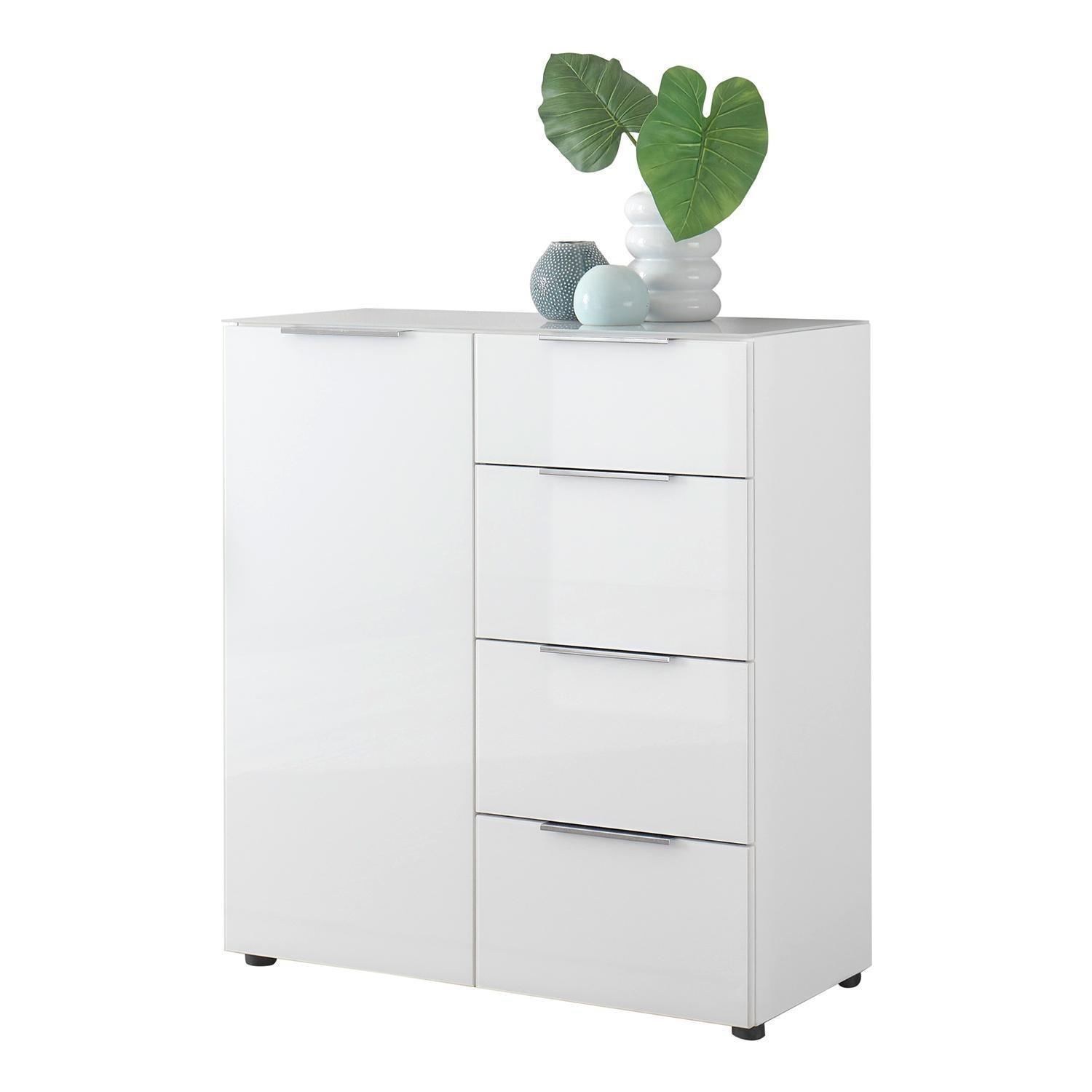 90 x 99 cm - 1 Tür - 4 Schubladen - Weißglas - Weiß matt