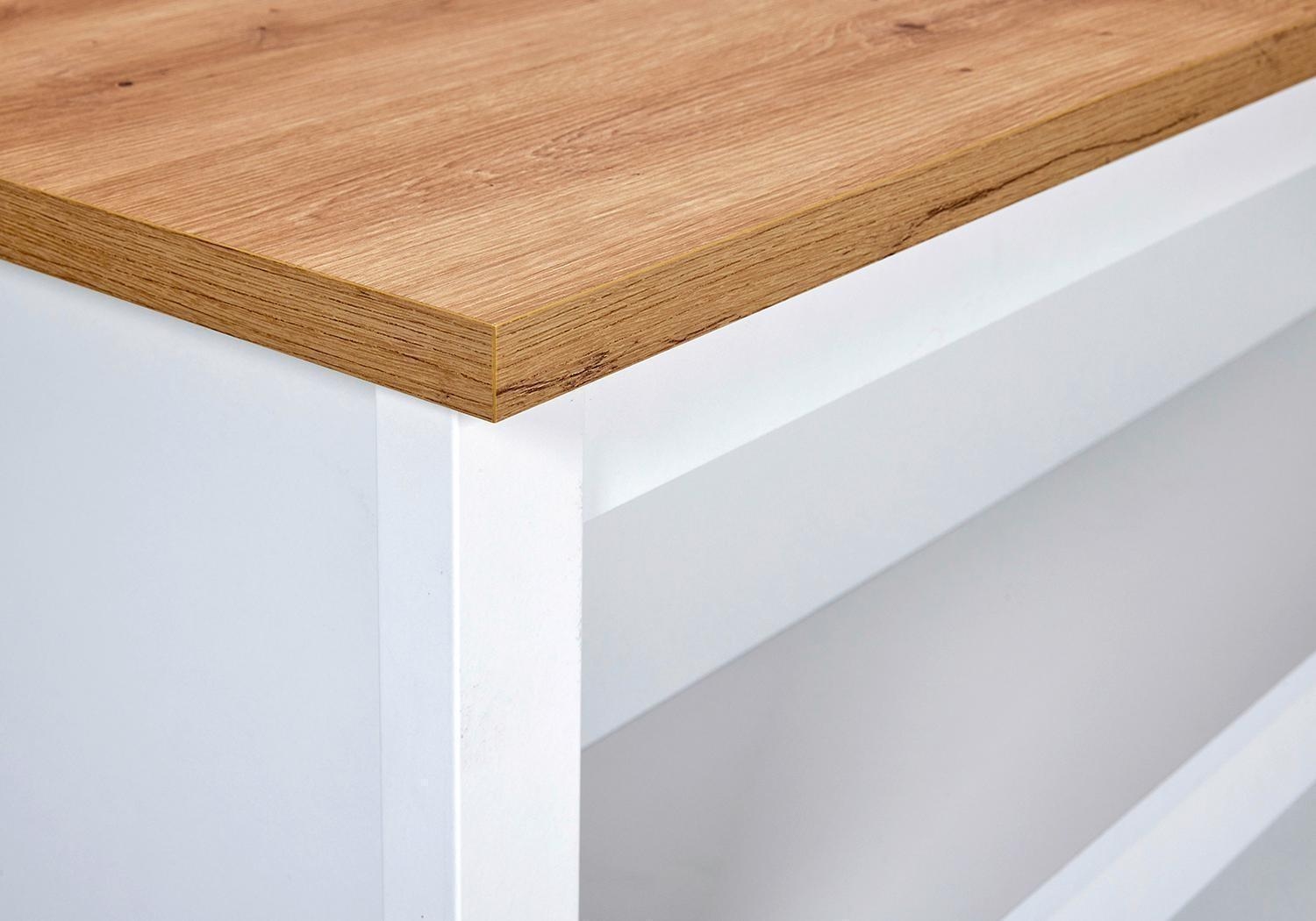 Die Kücheninsel SILVANO ist in Weiß gehalten und mit einer Arbeitsplatte in Artisan Eiche Dekor ausgestattet. Er verfügt über eine Tür und drei Schubladen mit Soft-Close-Funktion. Zudem ist noch ein fünffach höhenverstellbarer Einlegeboden vorhanden. Die Griffe bestehen aus pulverbeschichtetem Aluminium. Höhenverstellbare Füße ermöglichen eine individuelle Anpassung. Die Abmessungen betragen 124 cm in der Breite, 92 cm in der Höhe und 75 cm in der Tiefe.
