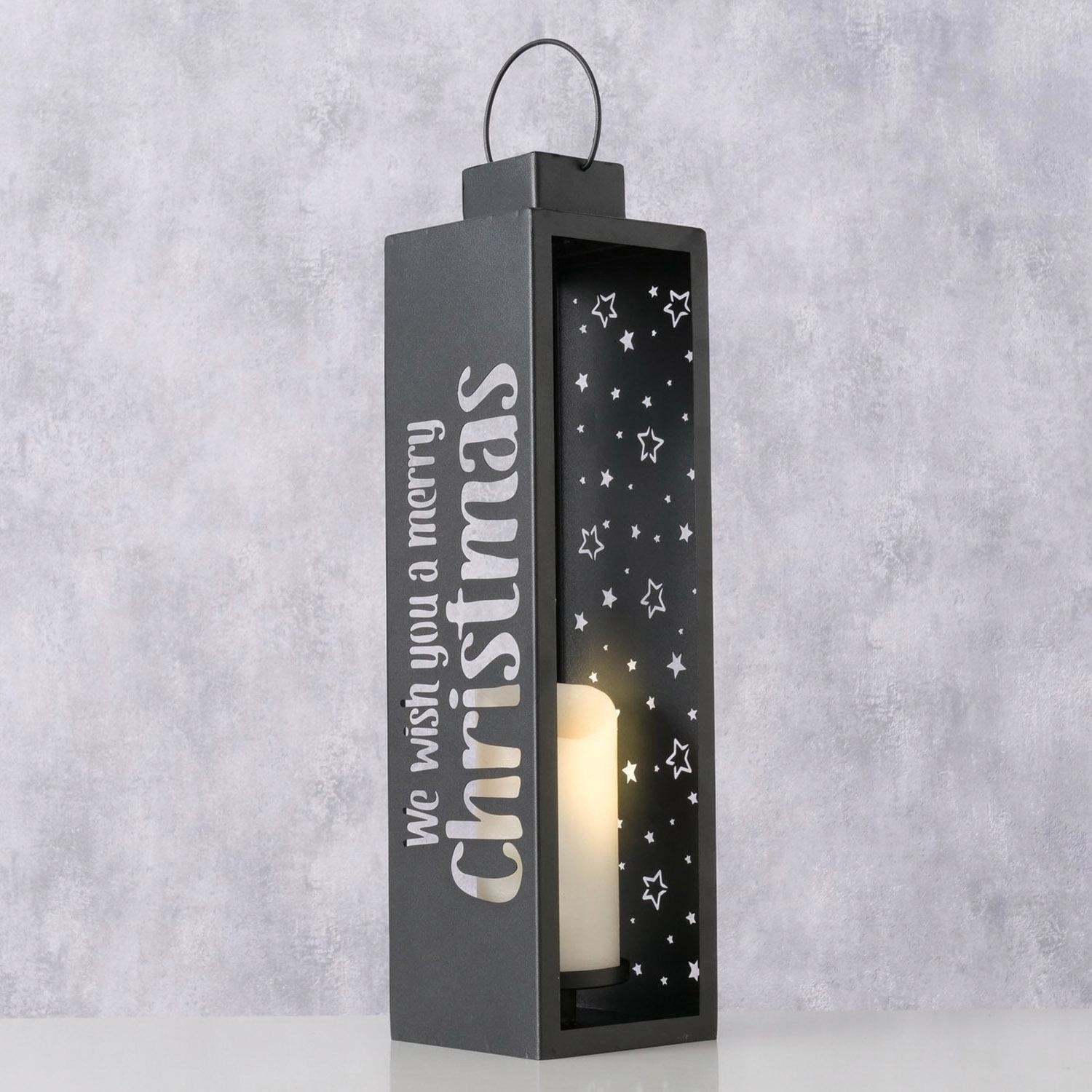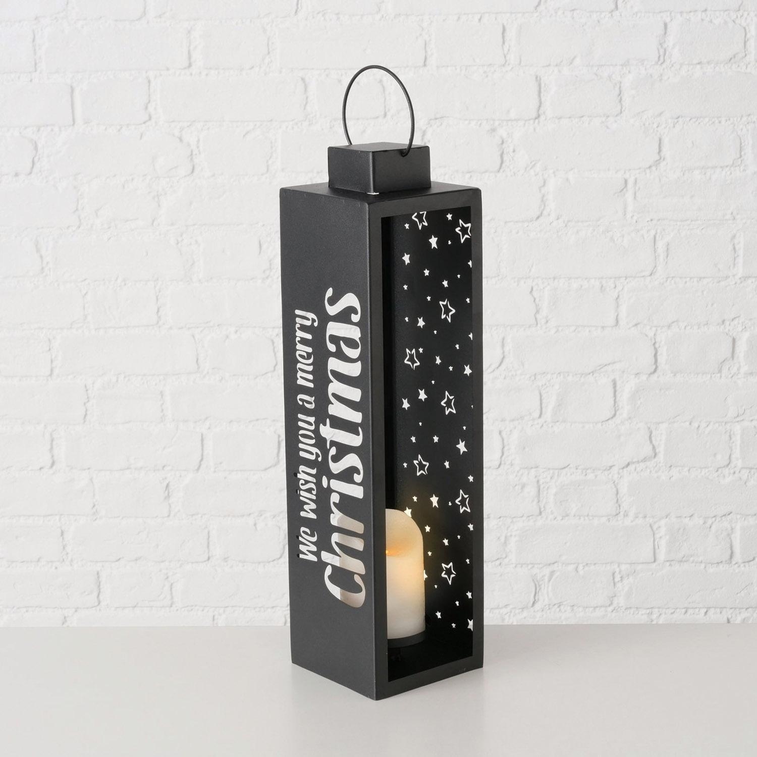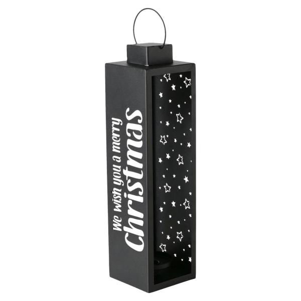 Die Laterne STARRY aus schwarzem Metall ist eine stilvolle Dekoration für die Weihnachtszeit. Mit dem Schriftzug "Merry Christmas" und weißen Sternen verziert, schafft sie eine festliche Atmosphäre. Im Inneren befindet sich ein Kerzenhalter, ideal für Stumpenkerzen, die warmes Licht spenden. Ein praktischer Tragegriff ermöglicht einfaches Platzieren. Mit Maßen von 12,5 cm Breite, 45,5 cm Höhe und 12 cm Tiefe ist die Laterne ein eleganter Blickfang.