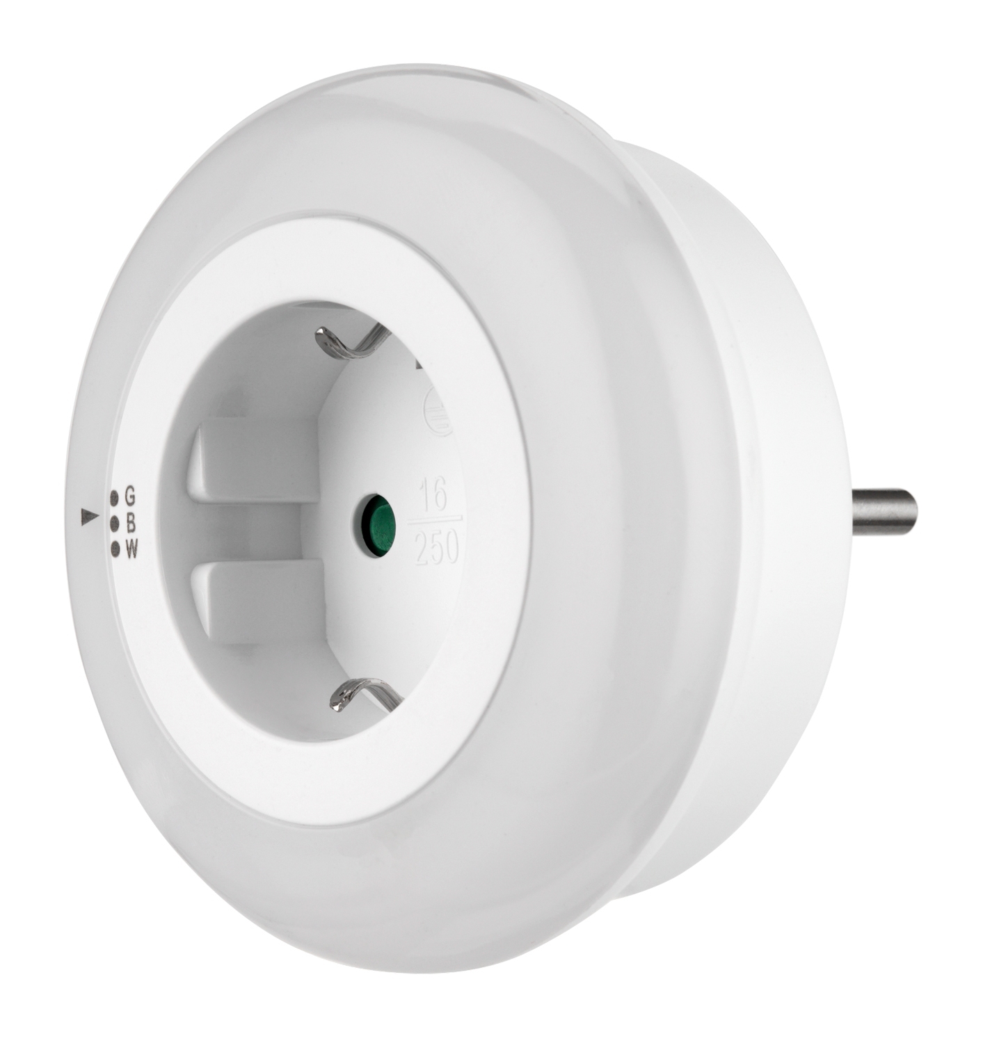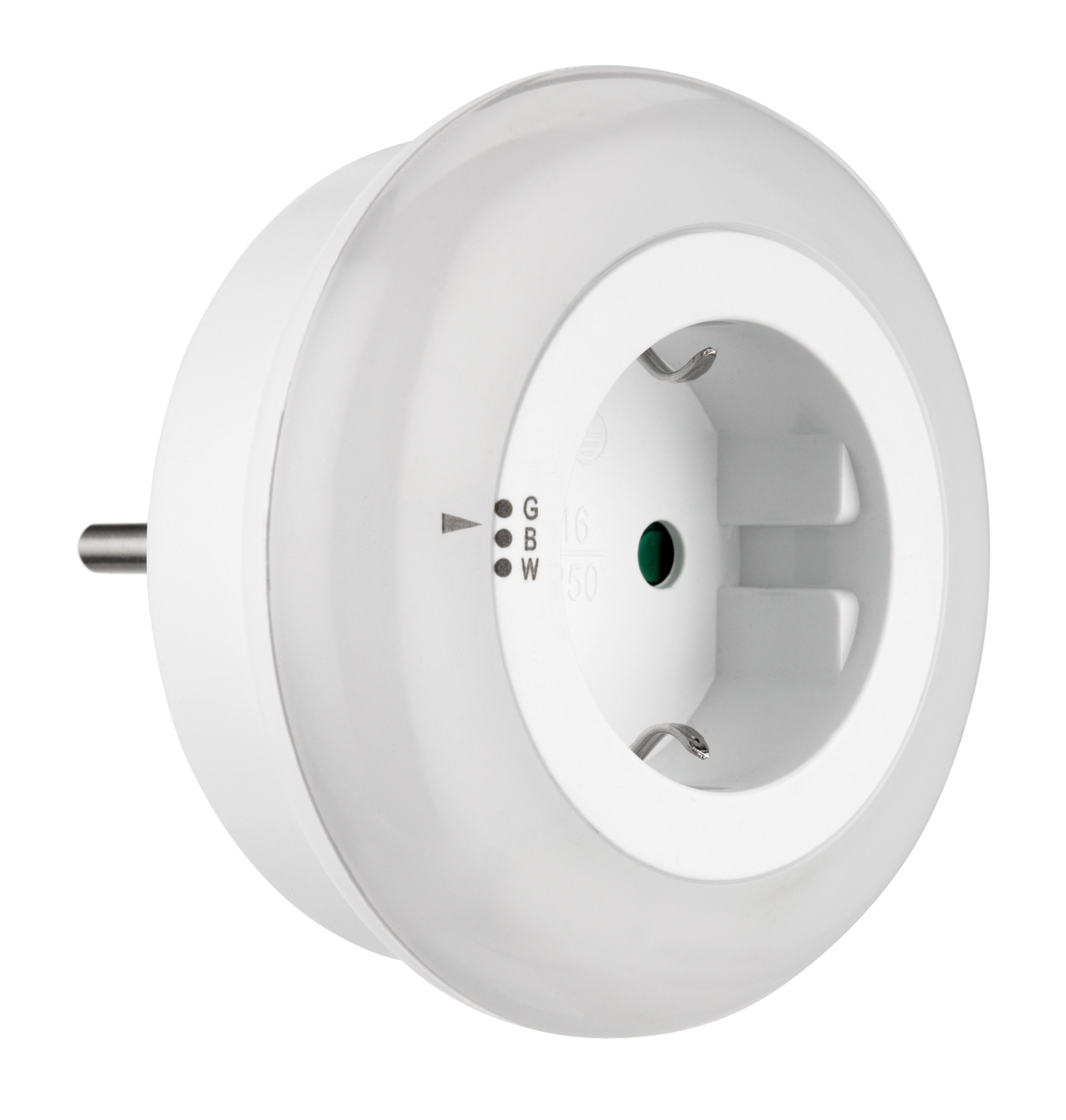 Das Nachtlicht ist in Weiß gehalten und besteht aus 3 LEDs, die nach manueller Einstellung buntes Licht verbreiten. Dank dem Drehschalter können Sie zwischen 3 Lichtfarben wählen: G für Grün, B für Blau und W für Weiß. Das kleine Licht ist außerdem mit einer Dämmerungsautomatik ausgestattet, welche sich bei 5 Lux (Einheit für Beleuchtungsstärke) einschaltet. Das Nachtlicht ist für Jung und Alt eine sinnvolle Ergänzung daheim. Nächtliches Stolpern vermeiden Sie so umgehend.