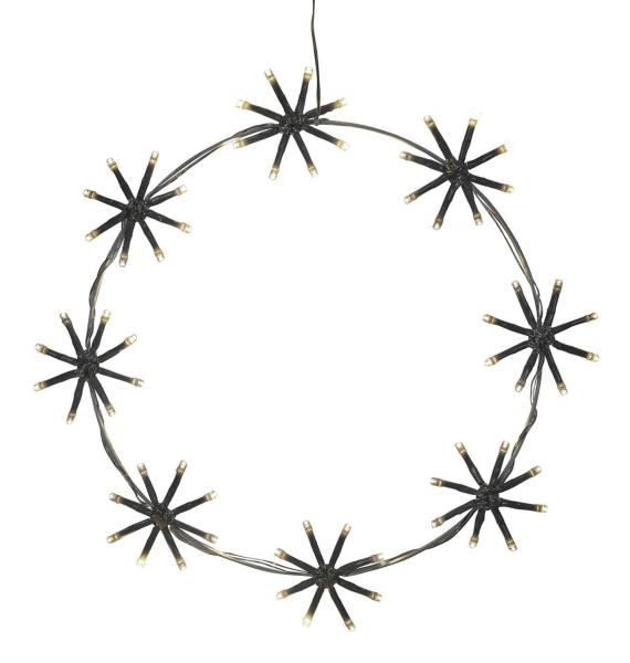 Der LED-Ring ROLENA besteht aus Metall in der Farbe Schwarz und ist mit Kabeln und Schneeflocken aus Kunststoff ausgestattet. Mit einem Durchmesser von 35 cm bietet er eine gleichmäßige, kreisförmige Form. Der Betrieb erfolgt über Batterien, wodurch eine flexible Platzierung ermöglicht wird. Acht Schneeflocken mit insgesamt 64 LED-Leuchtmitteln sorgen für eine gleichmäßige und helle Ausleuchtung.