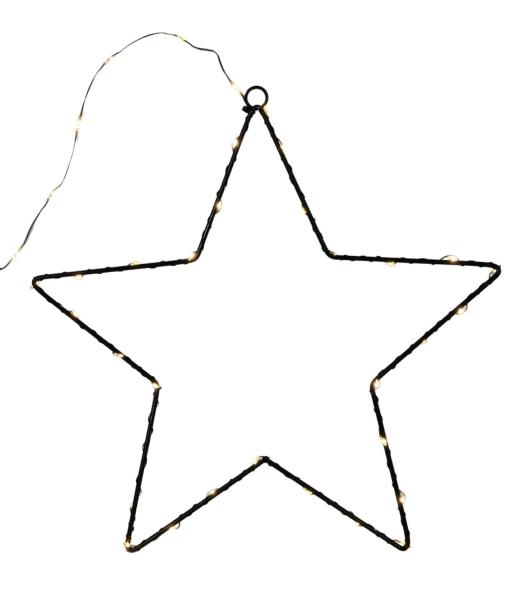 Der LED-Weihnachtsstern EUKALIA besteht aus schwarzem Metall und hat eine Größe von 30 x 30 cm. Er ist mit 40 LED-Leuchtmitteln ausgestattet und wird mit Batterien betrieben. Dank der IP44-Zertifizierung ist der Stern auch für den Außenbereich geeignet und kann flexibel platziert werden.