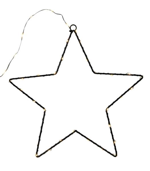 Der LED-Weihnachtsstern EUKALIA besteht aus schwarzem Metall und hat eine Größe von 50 x 50 cm. Er ist mit 50 LED-Leuchtmitteln ausgestattet und wird mit Batterien betrieben. Dank der IP44-Zertifizierung ist der Stern auch für den Außenbereich geeignet und kann flexibel platziert werden.