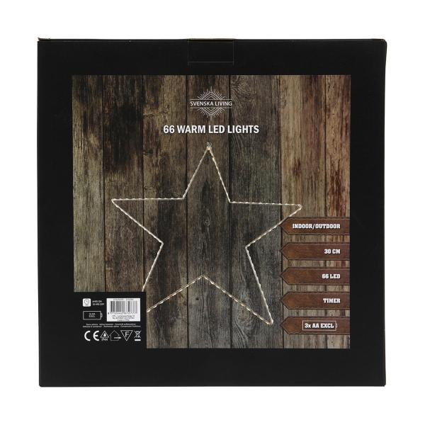 Der LED-Weihnachtsstern ROGAN besteht aus schwarzem Metall und hat eine Breite und Höhe von 30 cm sowie eine Tiefe von 3 cm. Er ist mit 66 LED-Leuchtmitteln ausgestattet, die in warmweißer Lichtfarbe leuchten, und wird batteriebetrieben. Durch die IP44-Zertifizierung ist der Stern auch für den Einsatz im Außenbereich geeignet und kann flexibel platziert werden.