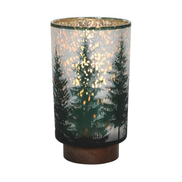 Das LED-Windlicht BRILETTA besteht aus weißem Glas und ist mit Tannenbäumen in Grün verziert. Es verfügt über einen Standfuß aus Holz, der für Stabilität sorgt. Das Windlicht wird batteriebetrieben und ist dadurch flexibel platzierbar. Mit einem Durchmesser von 12 cm und einer Höhe von 20 cm besitzt es ein handliches Format, das sich für verschiedene Dekorationsbereiche eignet.