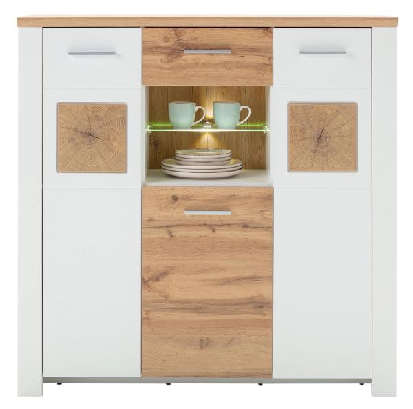 Das Highboard MATERA von LIV'IN vereint modernes Design mit rustikalem Flair. Das Gestell in Weiß supermatt Dekor bildet einen schönen Kontrast zur Oberplatte und den Teilfronten in Eiche Altholz Dekor. Mit 3 Türen, 1 Schublade und 1 offenen Fach bietet es reichlich Stauraum für verschiedenste Gegenstände. Ein besonderes Highlight ist der Glaseinlegeboden mit LED-Glaskantenbeleuchtung, der das Innere stilvoll in Szene setzt. Mit einer Breite von 122 cm, einer Höhe von 122 cm und einer Tiefe von 39 cm passt das Highboard auch in kleinere Räume und schafft dennoch eine beeindruckende Präsenz.