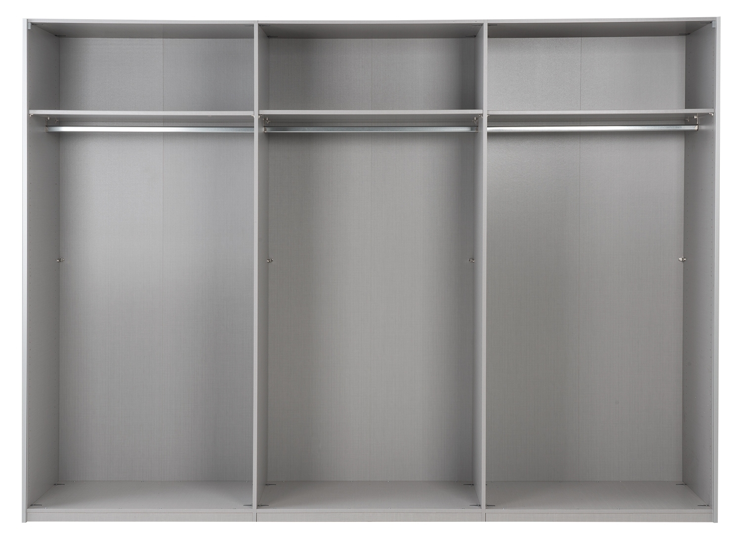 Dieser Kleiderschrank hat im Inneren die Farbe silbergrau. Zu einigen Kleiderschränken bieten wir Zubehör wie Schubkästeneinsätze, Wäscheeinteilungen, zusätzliche Fachböden und Türdämpfer an.