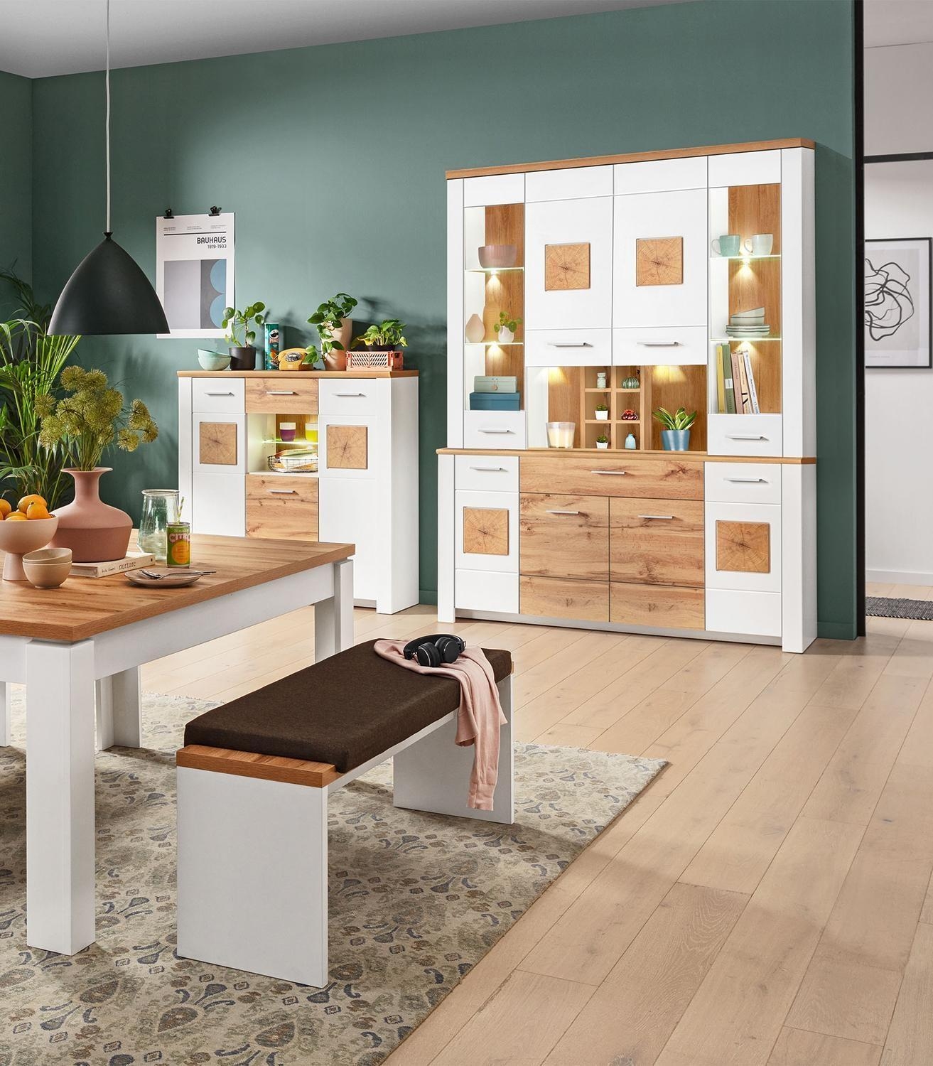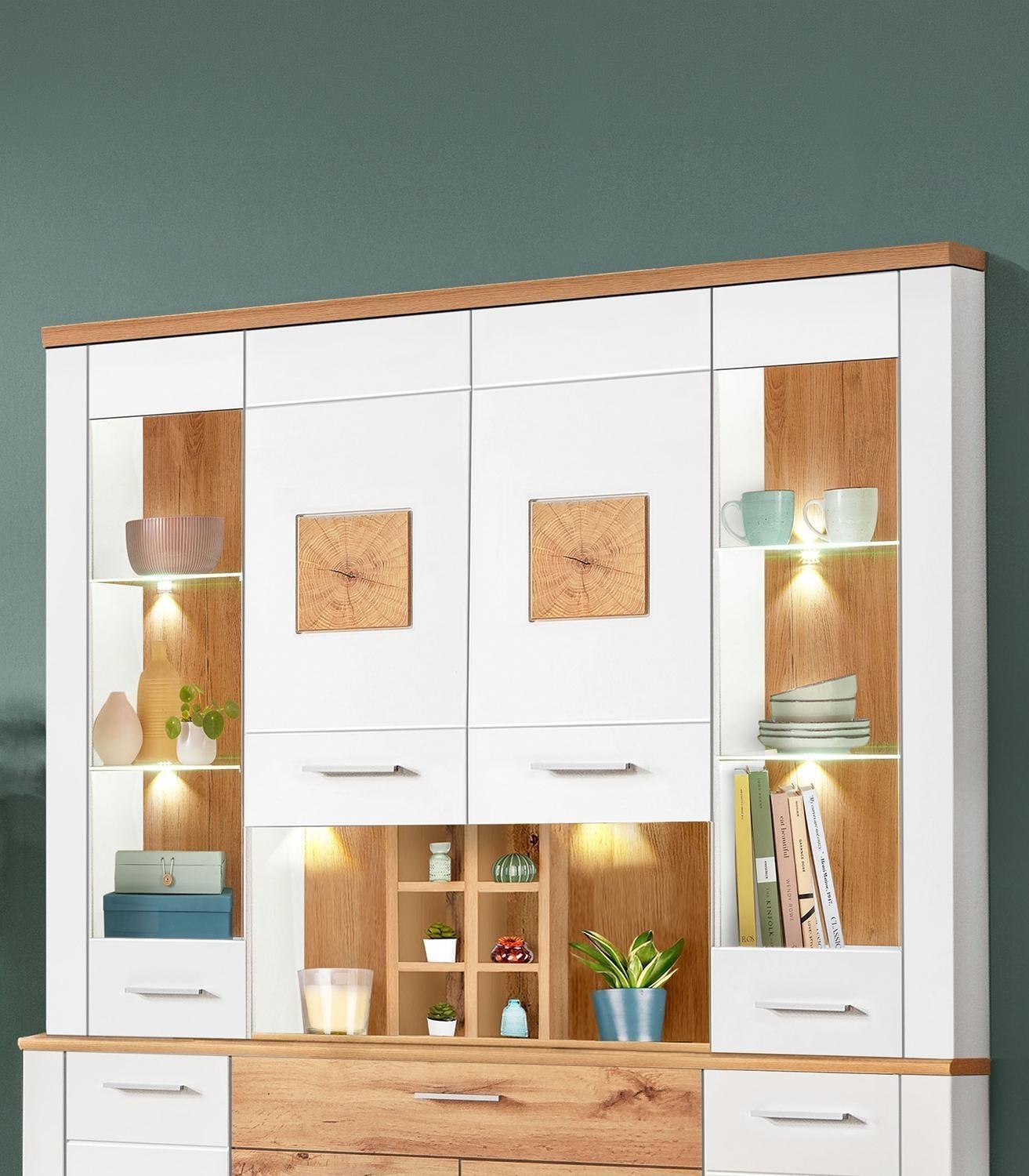 Der Sideboard-Aufsatz MATERA der Marke LIV’IN ist in Weiß supermatt gestaltet und verfügt über eine Oberplatte sowie Absetzungen in Eiche Altholz Dekor. Diese Aufsatzlösung ist mit zwei Türen inklusive Glasteilfronten sowie zwei Türen mit Soft-Close-Funktion ausgestattet. Das Möbelstück weist vier Glasböden, zwei Einlegeböden und acht Ablagefächer auf. Die Abmessungen belaufen sich auf eine Breite von 164 cm, eine Höhe von 115 cm sowie eine Tiefe von 39 cm. Die LED-Beleuchtung ist mit im Lieferumfang enthalten.