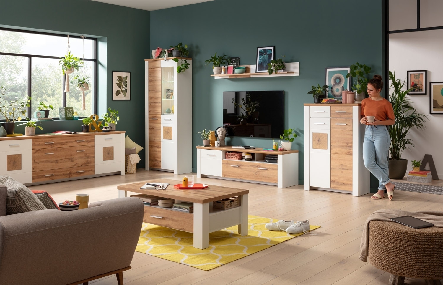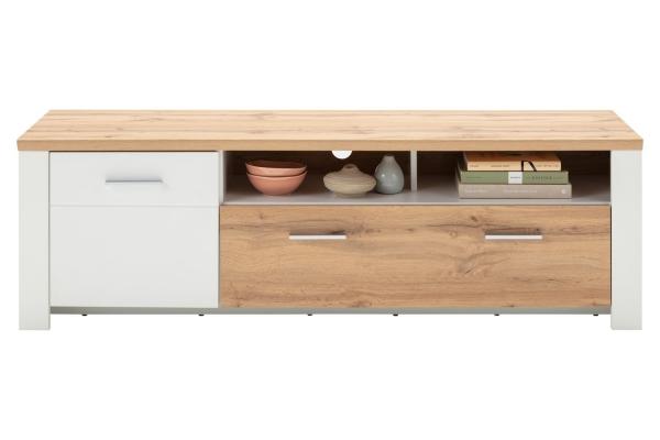 Das TV Lowboard MATERA von LIV'IN vereint zeitgemäßes Design mit rustikalem Charme. Das Gestell in Weiß supermatt Dekor bildet einen ansprechenden Kontrast zur Absetzung in Eiche Altholz Dekor. Mit einer Breite von 164 cm bietet das Lowboard ausreichend Platz für Ihren Fernseher und Multimedia-Geräte. Ein offenes Ablagefach ermöglicht die ordentliche Aufbewahrung von DVDs, Fernbedienungen und anderen Utensilien. Zudem verfügt das Lowboard über eine Tür und eine Schublade, die zusätzlichen Stauraum bieten. Mit einer Höhe von 51 cm und einer Tiefe von 46 cm passt das Lowboard perfekt in Ihr Wohnzimmer.