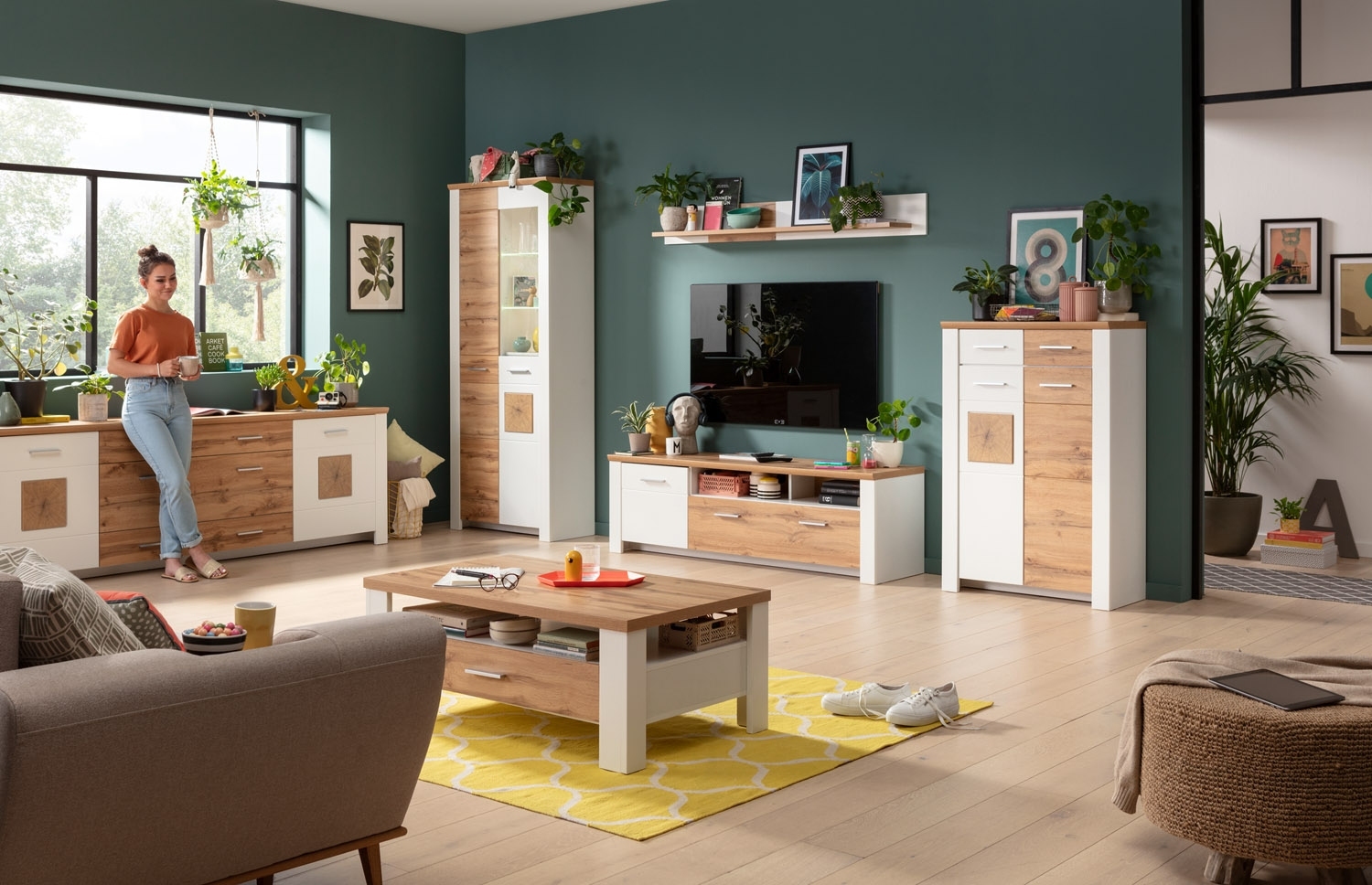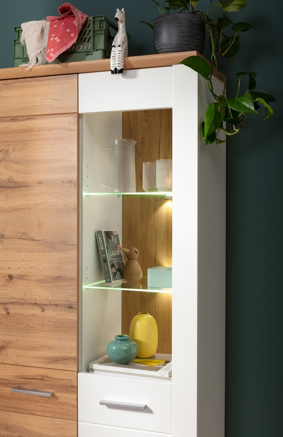 Die Vitrine MATERA von LIV'IN vereint modernes Design mit rustikalem Flair. Das Gestell in Weiß supermatt Dekor bildet einen stilvollen Kontrast zur Absetzung in Eiche Altholz Dekor. Mit einer Breite von 80 cm, einer Höhe von 202 cm und einer Tiefe von 39 cm bietet die Vitrine ausreichend Platz für die Präsentation Ihrer Lieblingsstücke. Sie verfügt über eine Tür und eine Glastür, die den Blick auf das Innere freigeben und gleichzeitig Ihre Gegenstände schützen. Die integrierte LED-Glaskantenbeleuchtung setzt Ihre Sammlerstücke oder Dekoartikel gekonnt in Szene und schafft eine einladende Atmosphäre.
