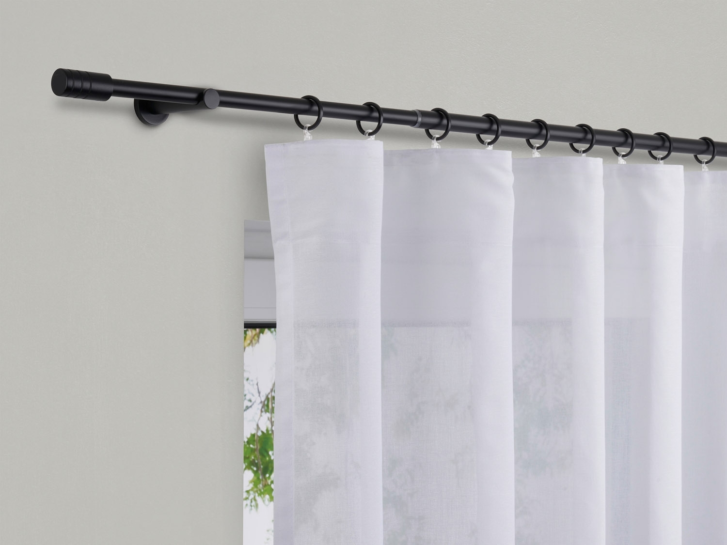 | Lieferumfang: | 1 Gardinenstange, 2 Endstücke, 3 Träger, Gardinenringe mit Faltenhaken und Montagematerial. |