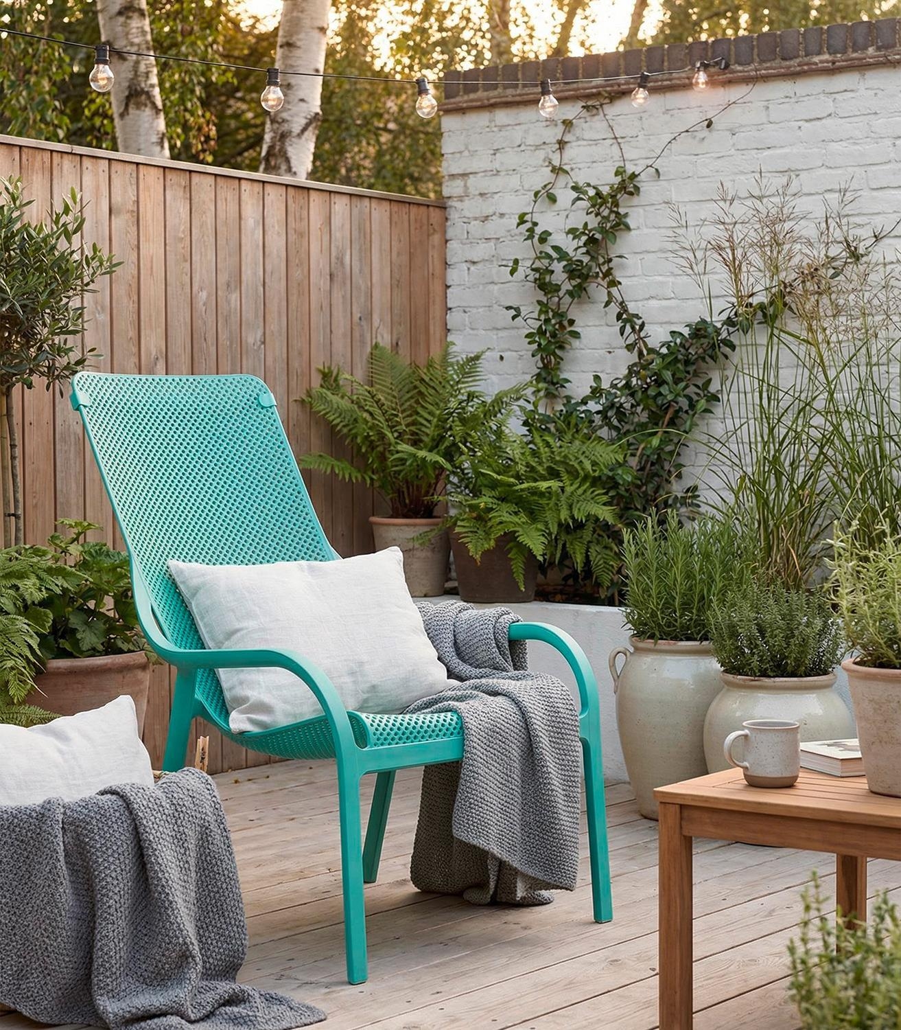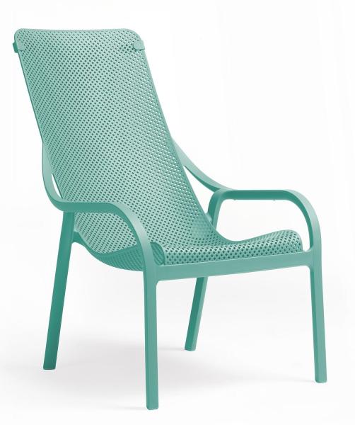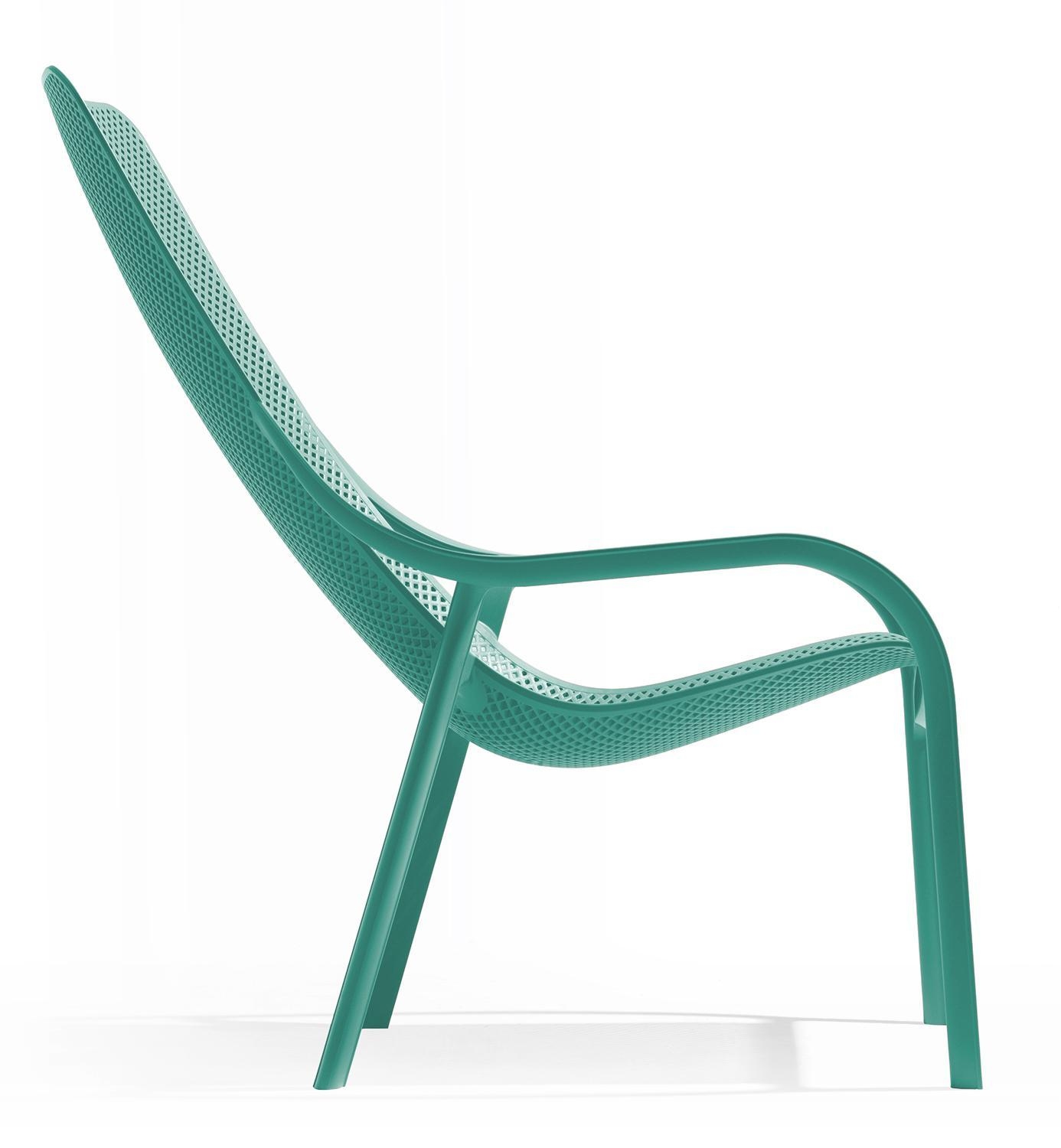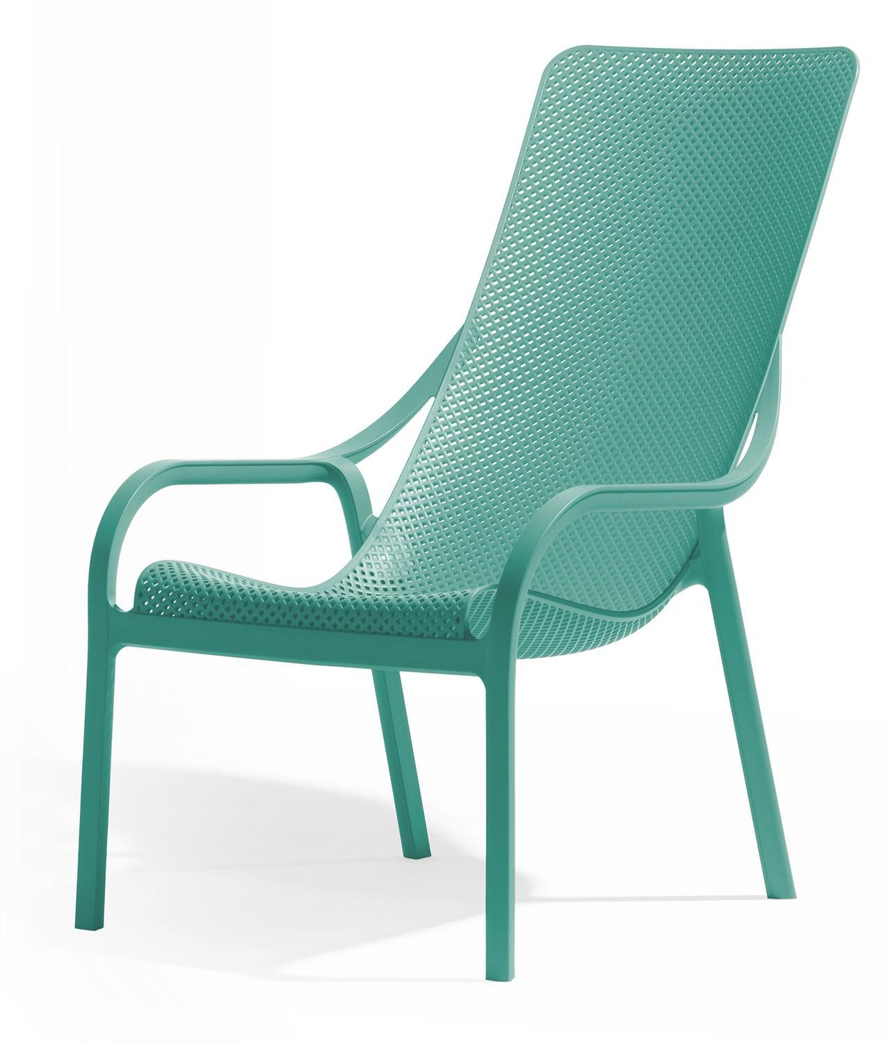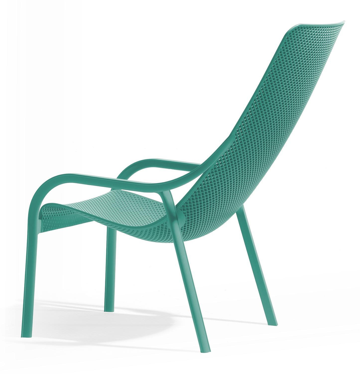 Der Gartensessel NET LOUNGE der Marke Nardi besteht aus glasfaserverstärktem Polypropylen in der Farbe Türkis mit einem Matt-Effekt. Diese Sitzgelegenheit hat eine Breite von 62 cm, eine Höhe von 99 cm sowie eine Tiefe von 90 cm bei einer Sitzhöhe von 42 cm. Die Ausstattung umfasst Armlehnen und seitliche Klammern zur Befestigung von Handtüchern. Zur platzsparenden Lagerung lässt sich dieser stapelbare Outdoor-Sessel mit mehreren Modellen übereinanderstellen.