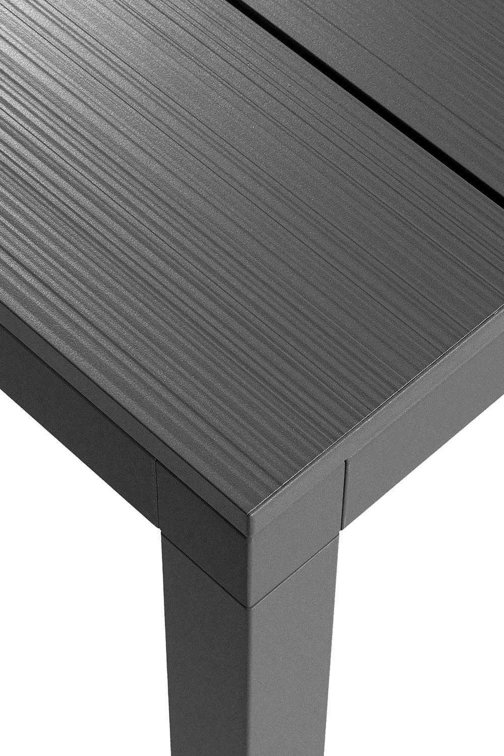 Regenwasser kann einfach durch die Rillen zwischen den einzelnen Elementen der Tischplatte ablaufen. Dadurch kann es sich nicht sammeln und das Material verwittern oder beschädigen.