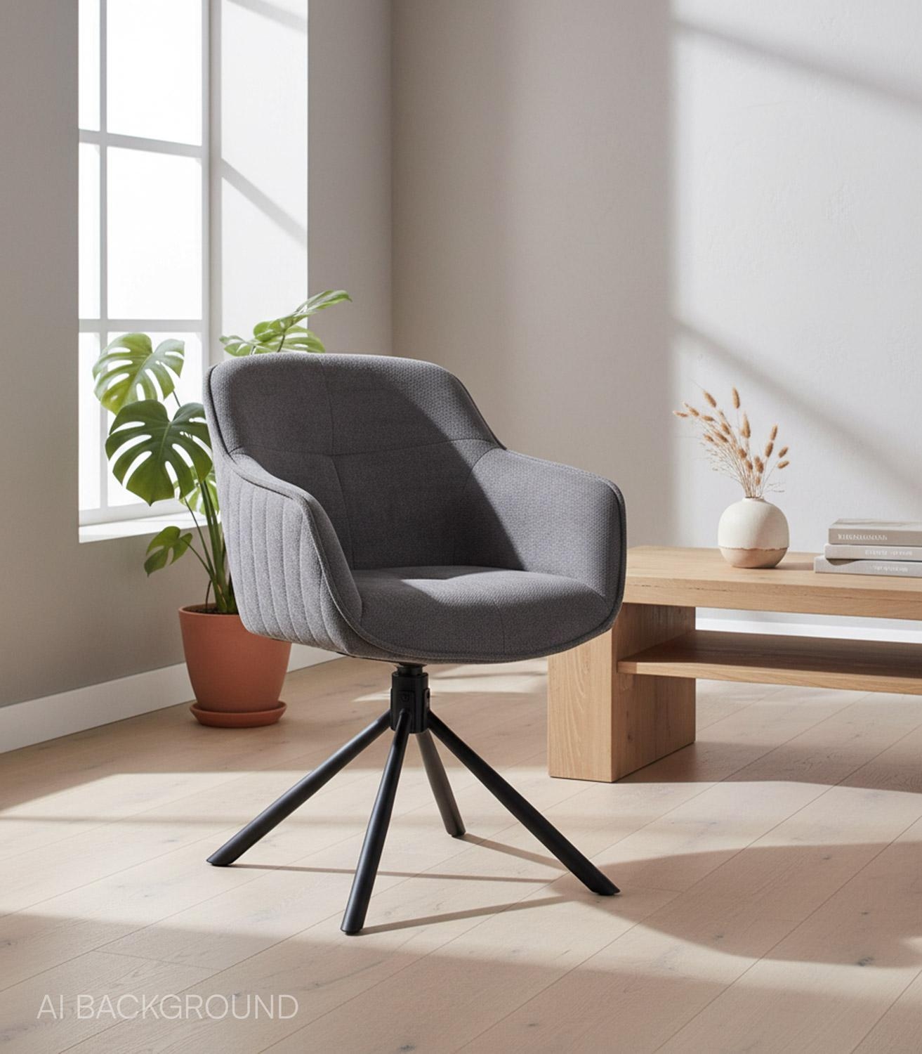 Der Polsterstuhl ERWIN ist mit einem grauen Webstoffbezug ausgestattet. Das Gestell besteht aus schwarzem Metall und bietet eine stabile Basis. Der Außenbezug ist mit Diamantsteppungen versehen, die dem Stuhl eine strukturierte Oberfläche verleihen. Die Sitzschale ist um 180 Grad drehbar und verfügt über eine automatische Rückholfunktion. Die maximale Belastbarkeit beträgt 120 kg. Die Abmessungen des Stuhls betragen 59 cm in der Breite, 82 cm in der Höhe und 62 cm in der Tiefe.
