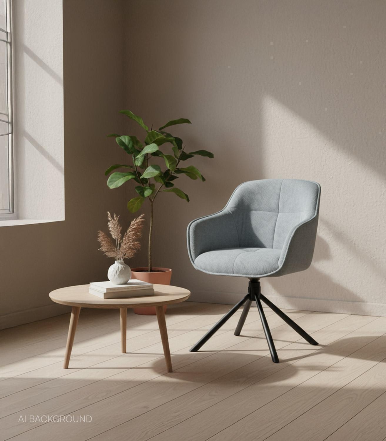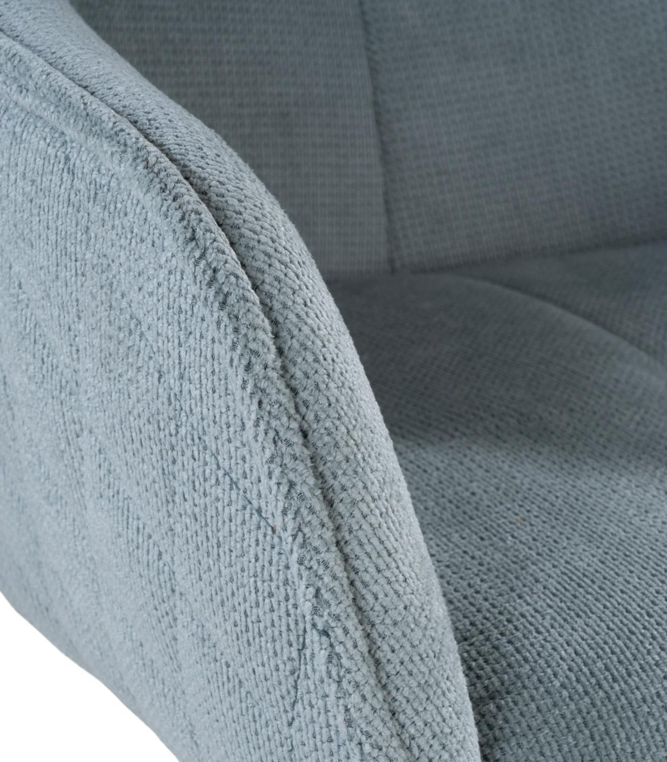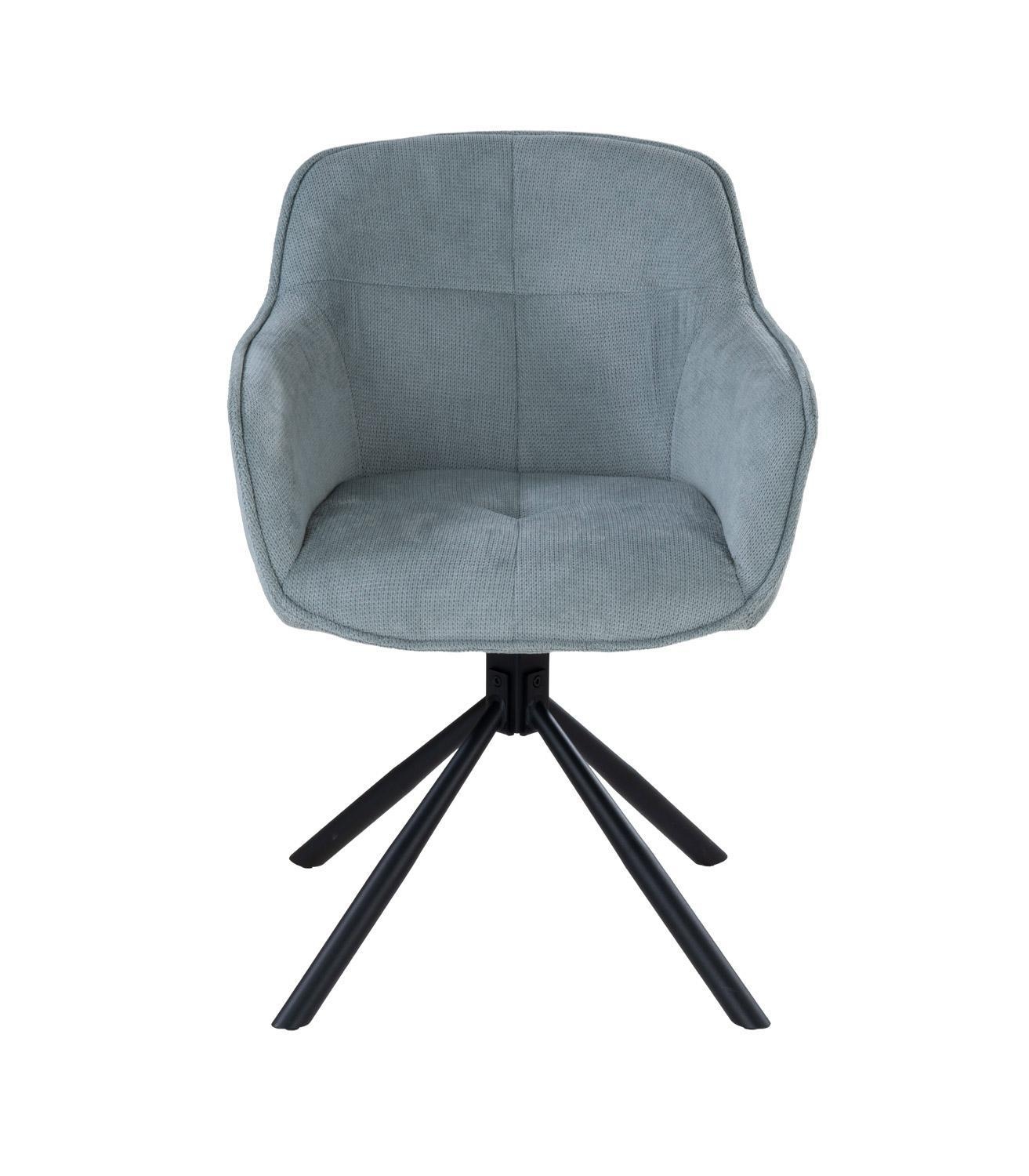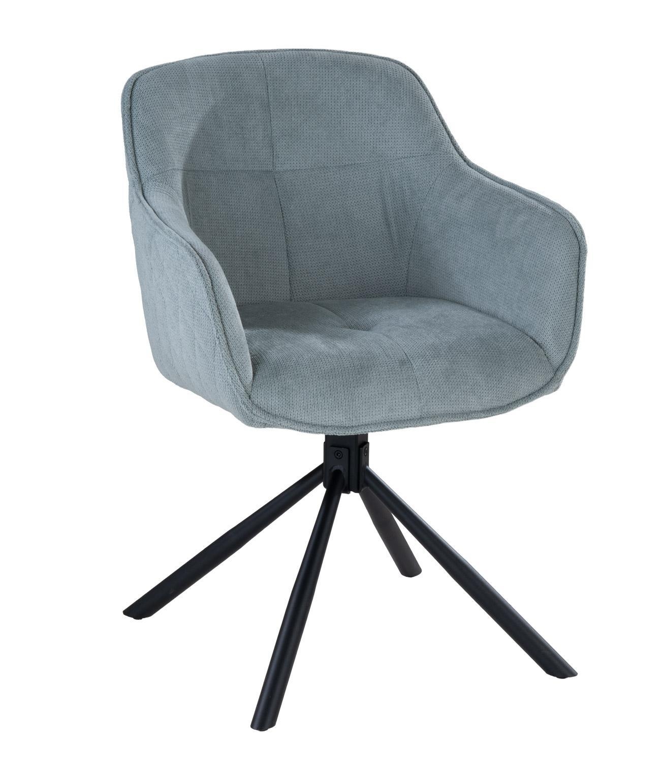 Der Polsterstuhl ERWIN ist mit einem salbeigrünen Webstoffbezug ausgestattet. Das Gestell besteht aus schwarzem Metall und bietet eine stabile Basis. Der Außenbezug ist mit Diamantsteppungen versehen, die dem Stuhl eine strukturierte Oberfläche verleihen. Die Sitzschale ist um 180 Grad drehbar und verfügt über eine automatische Rückholfunktion. Die maximale Belastbarkeit beträgt 120 kg. Die Abmessungen des Stuhls betragen 59 cm in der Breite, 82 cm in der Höhe und 62 cm in der Tiefe.