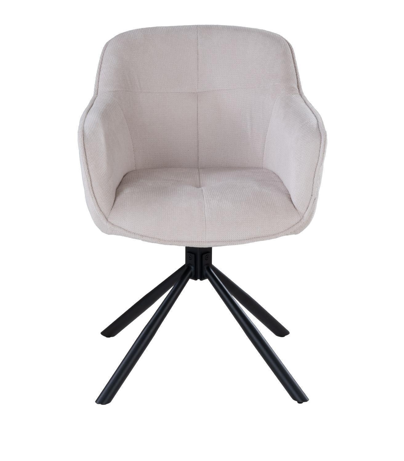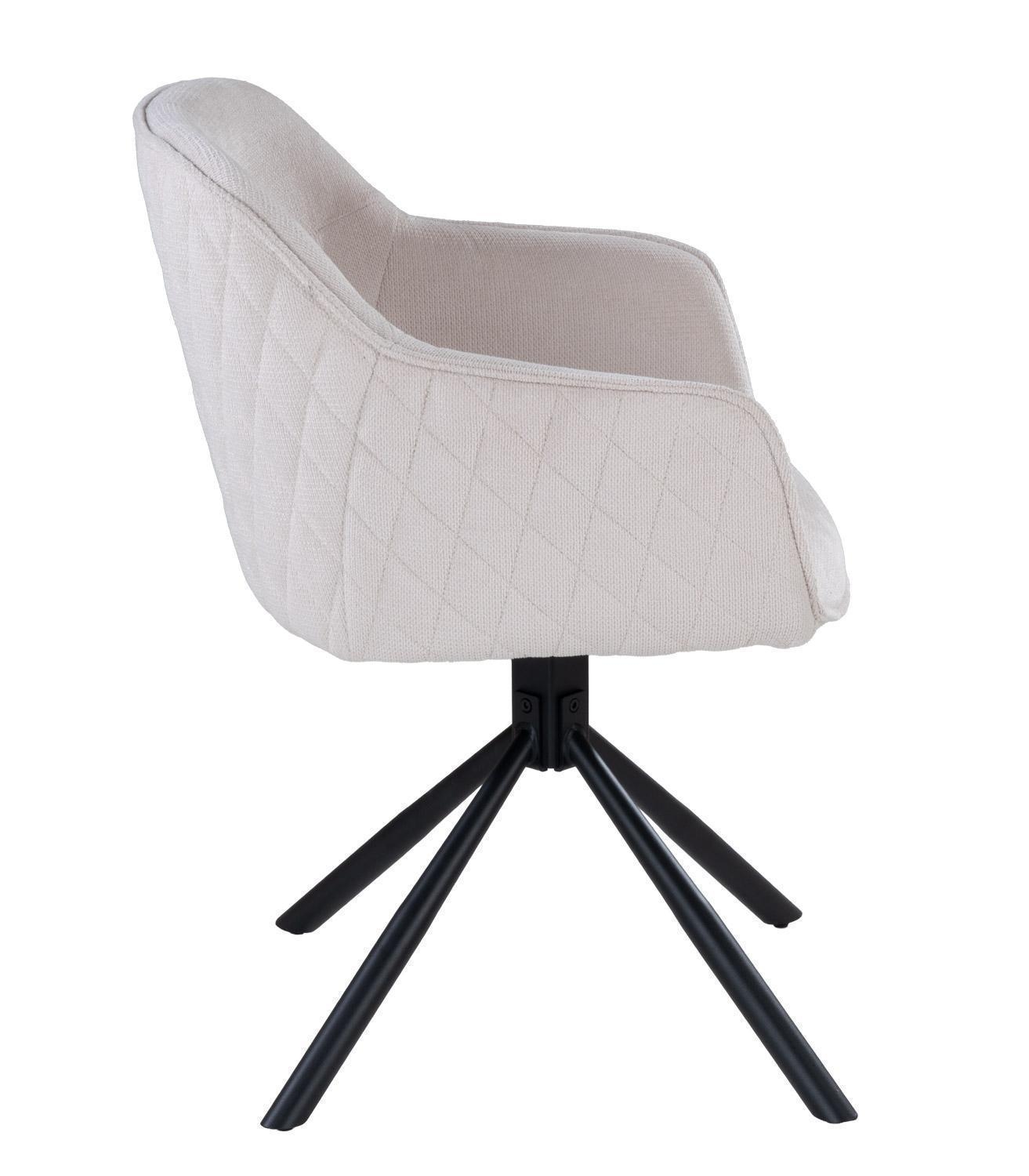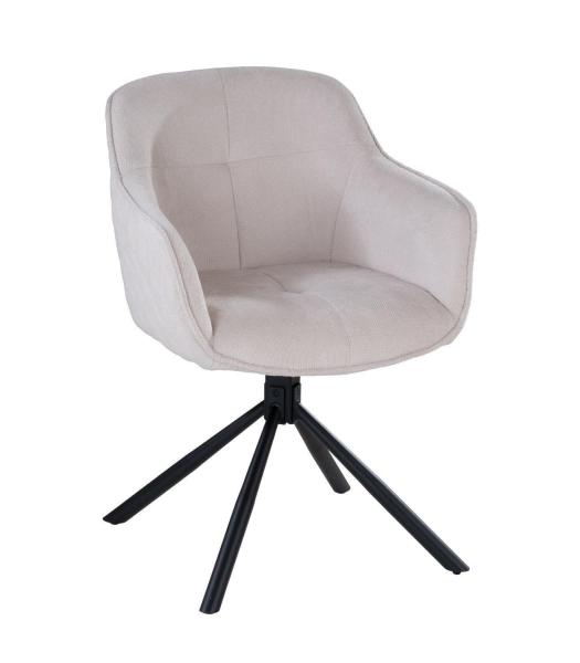 Der Polsterstuhl ERWIN ist mit einem beigen Webstoffbezug ausgestattet. Das Gestell besteht aus schwarzem Metall und bietet eine stabile Basis. Der Außenbezug ist mit Diamantsteppungen versehen, die dem Stuhl eine strukturierte Oberfläche verleihen. Die Sitzschale ist um 180 Grad drehbar und verfügt über eine automatische Rückholfunktion. Die maximale Belastbarkeit beträgt 120 kg. Die Abmessungen des Stuhls betragen 59 cm in der Breite, 82 cm in der Höhe und 62 cm in der Tiefe.