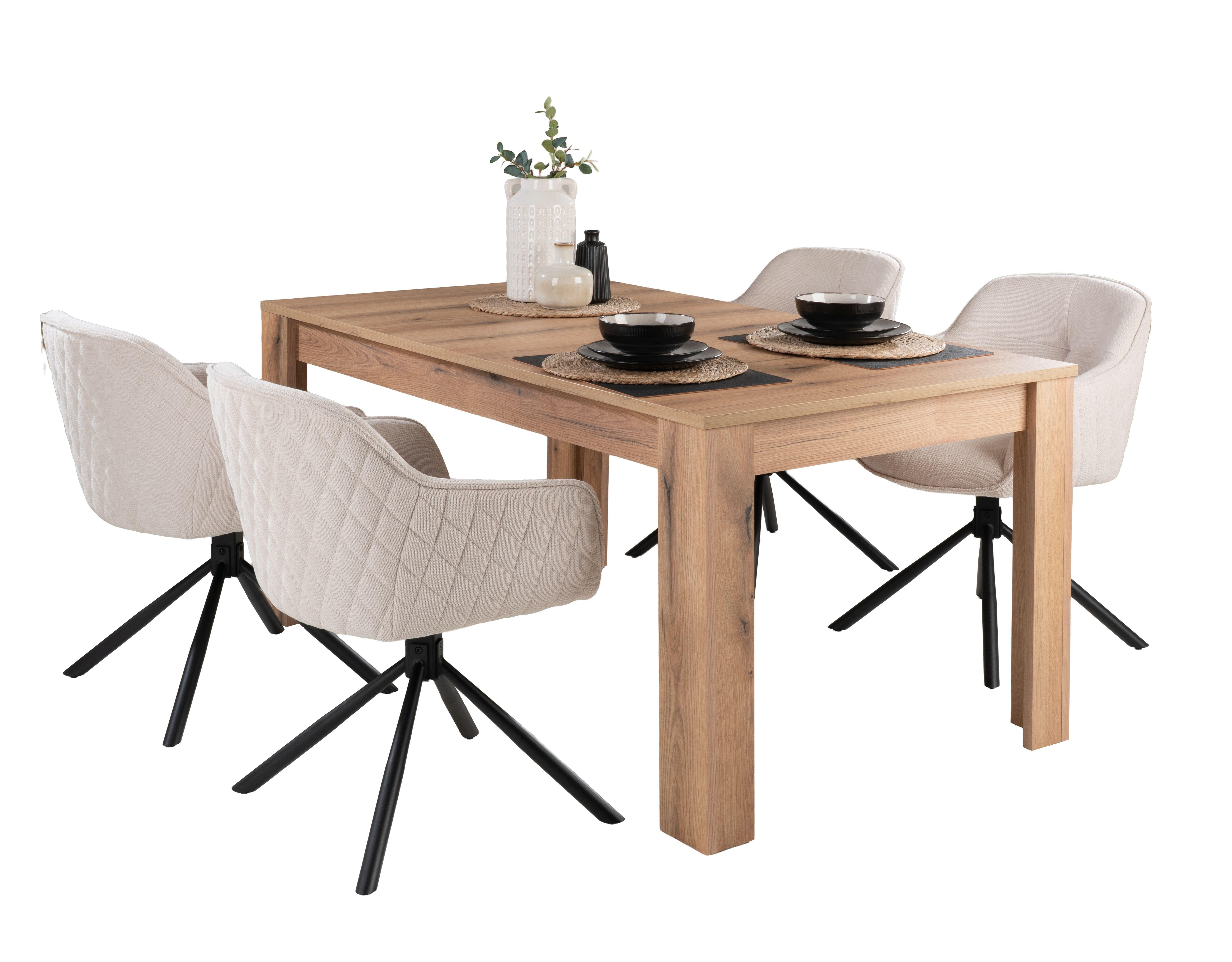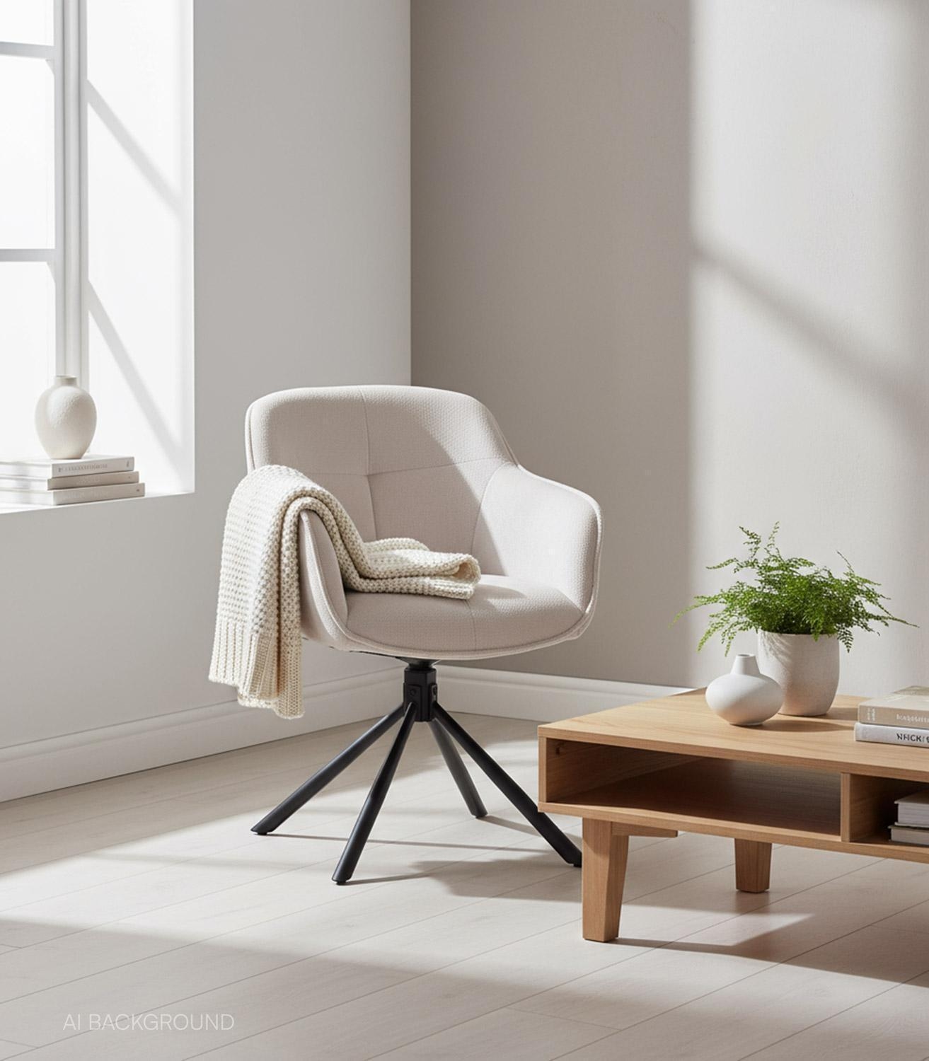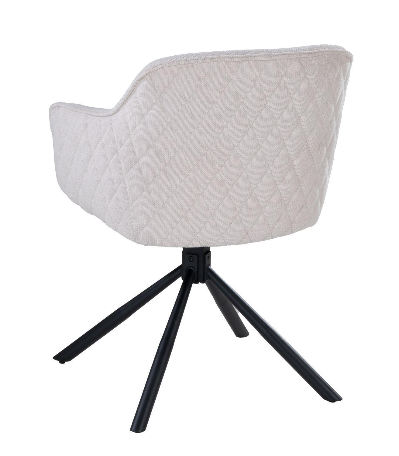 Der Polsterstuhl ERWIN ist mit einem beigen Webstoffbezug ausgestattet. Das Gestell besteht aus schwarzem Metall und bietet eine stabile Basis. Der Außenbezug ist mit Diamantsteppungen versehen, die dem Stuhl eine strukturierte Oberfläche verleihen. Die Sitzschale ist um 180 Grad drehbar und verfügt über eine automatische Rückholfunktion. Die maximale Belastbarkeit beträgt 120 kg. Die Abmessungen des Stuhls betragen 59 cm in der Breite, 82 cm in der Höhe und 62 cm in der Tiefe.