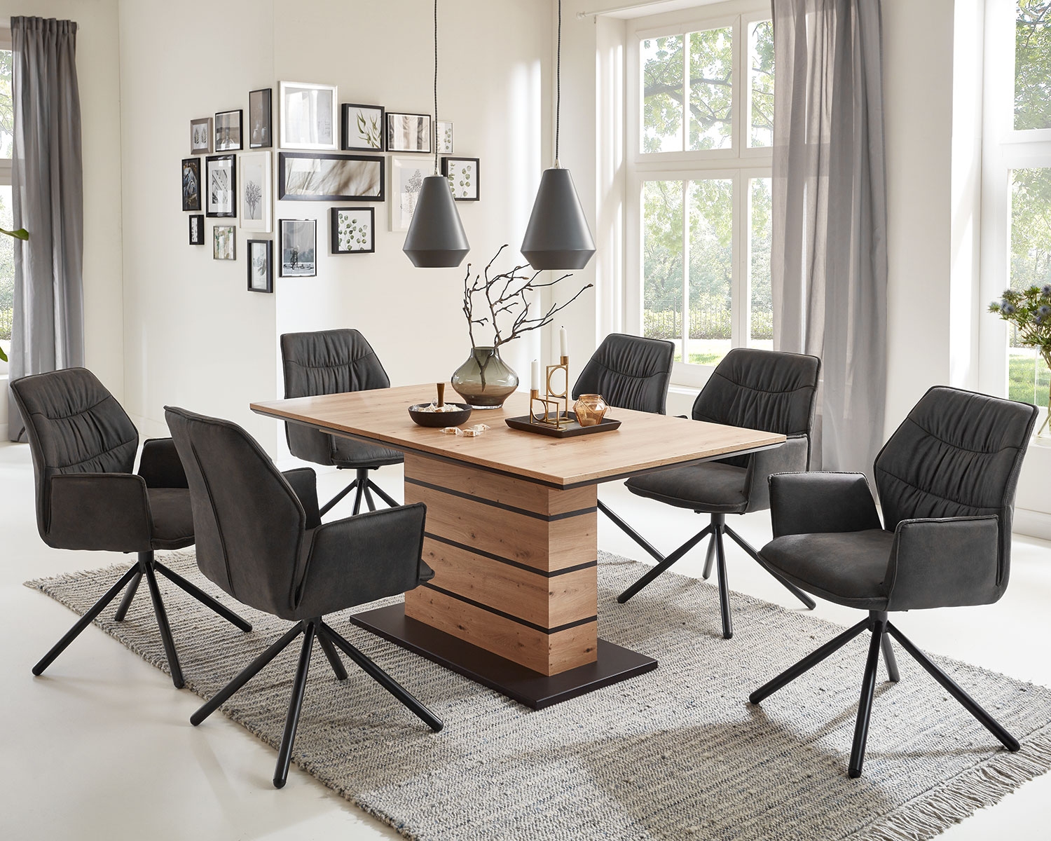 Der Polsterstuhl lässt sich um 180 Grad drehen. Mit der automatischen Rückholfunktion wird die Sitzschale nach dem Drehen wieder in die ursprüngliche Sitzposition zurück geführt.