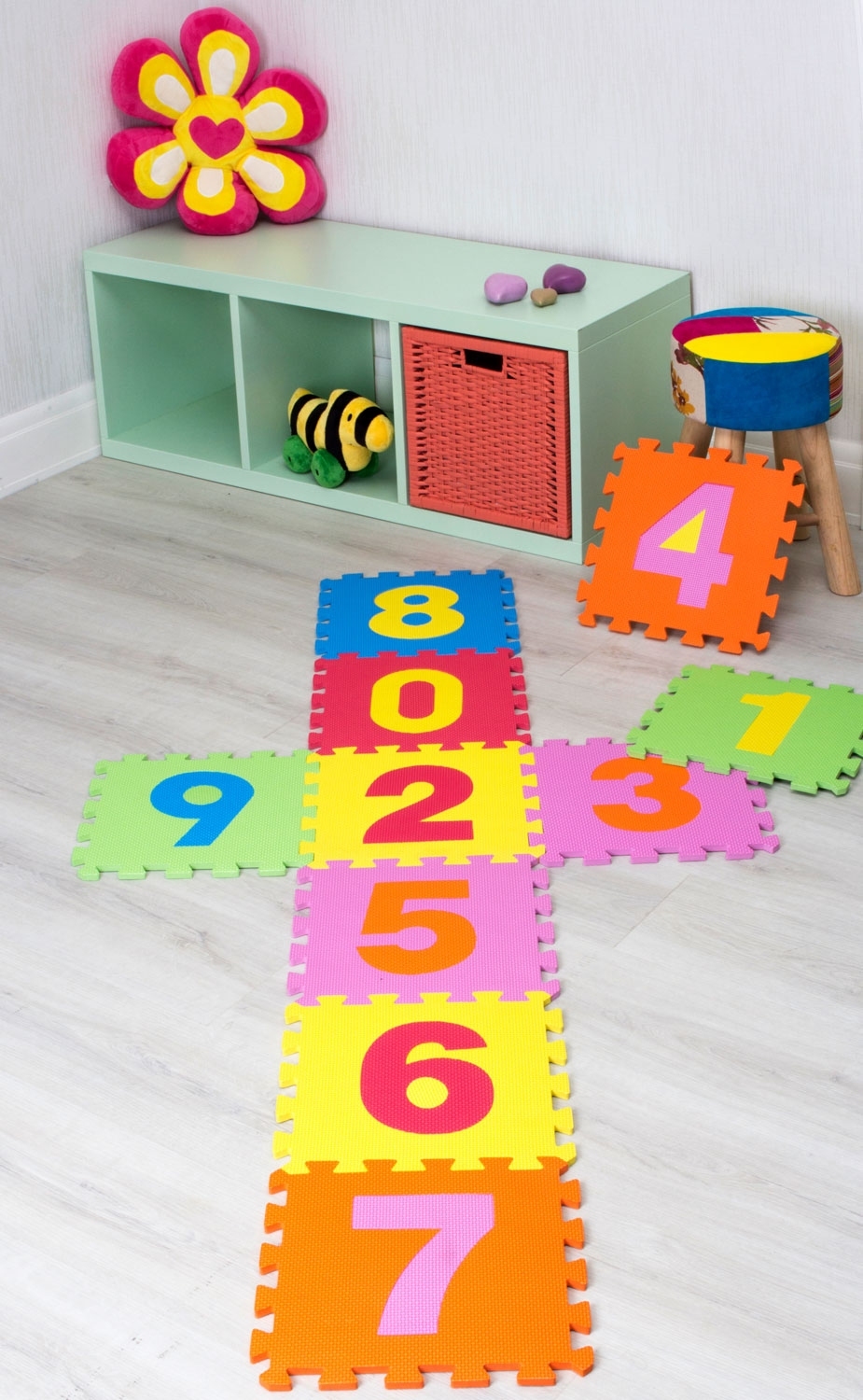 Die Puzzle-Matte PUZZLY besteht aus 10 einzelnen Matten in lebhaften Farben, die für Spaß und Abwechslung beim Spielen sorgen. Jede Matte hat eine Breite von 30 cm und eine Tiefe von 30 cm, mit einer Höhe von 1 cm. Diese Matte eignet sich ideal als Spielteppich und bietet eine weiche Unterlage für Kinderaktivitäten. Dank ihrer feuchtigkeitsabweisenden Eigenschaften ist sie leicht zu reinigen und bleibt hygienisch.