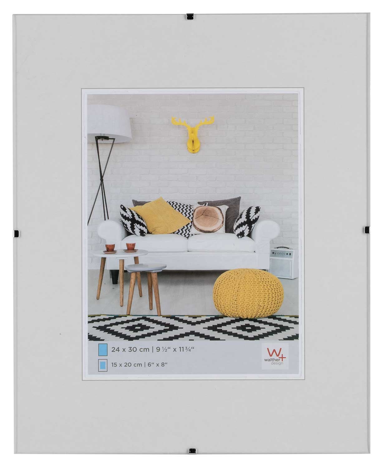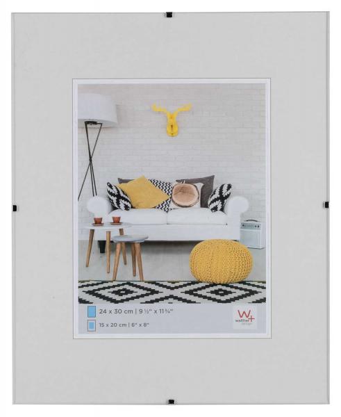 Der rahmenlose Bildhalter aus Klarglas hat eine Größe von 24 x 30 cm. Im Rahmen befindet sich ein Passepartout, passend für eine Bildgröße von 15 x 20 cm. Ohne Passepartout kann auch eine Bildgröße von 24 x 30 cm verwendet werden.