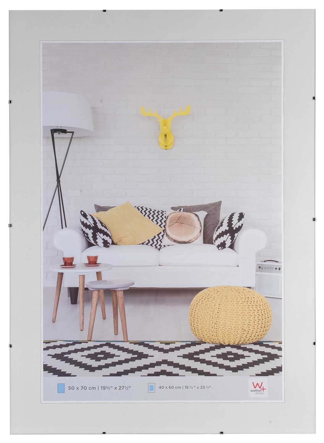 Der rahmenlose Bildhalter aus Klarglas hat eine Größe von 50 x 70 cm. Im Rahmen befindet sich ein Passepartout, passend für eine Bildgröße von 40 x 50 cm. Ohne Passepartout kann auch eine Bildgröße von 50 x 70 cm verwendet werden.