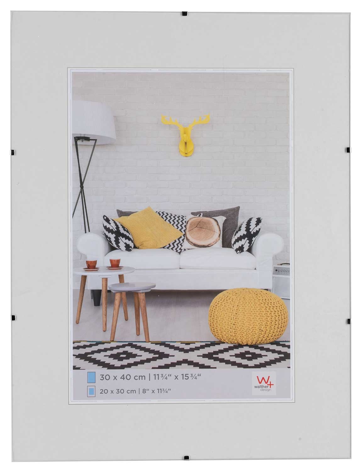 Der rahmenlose Bildhalter aus Klarglas hat eine Größe von 30 x 40 cm. Im Rahmen befindet sich ein Passepartout, passend für eine Bildgröße von 20 x 27 cm. Ohne Passepartout kann auch eine Bildgröße von 30 x 40 cm verwendet werden.