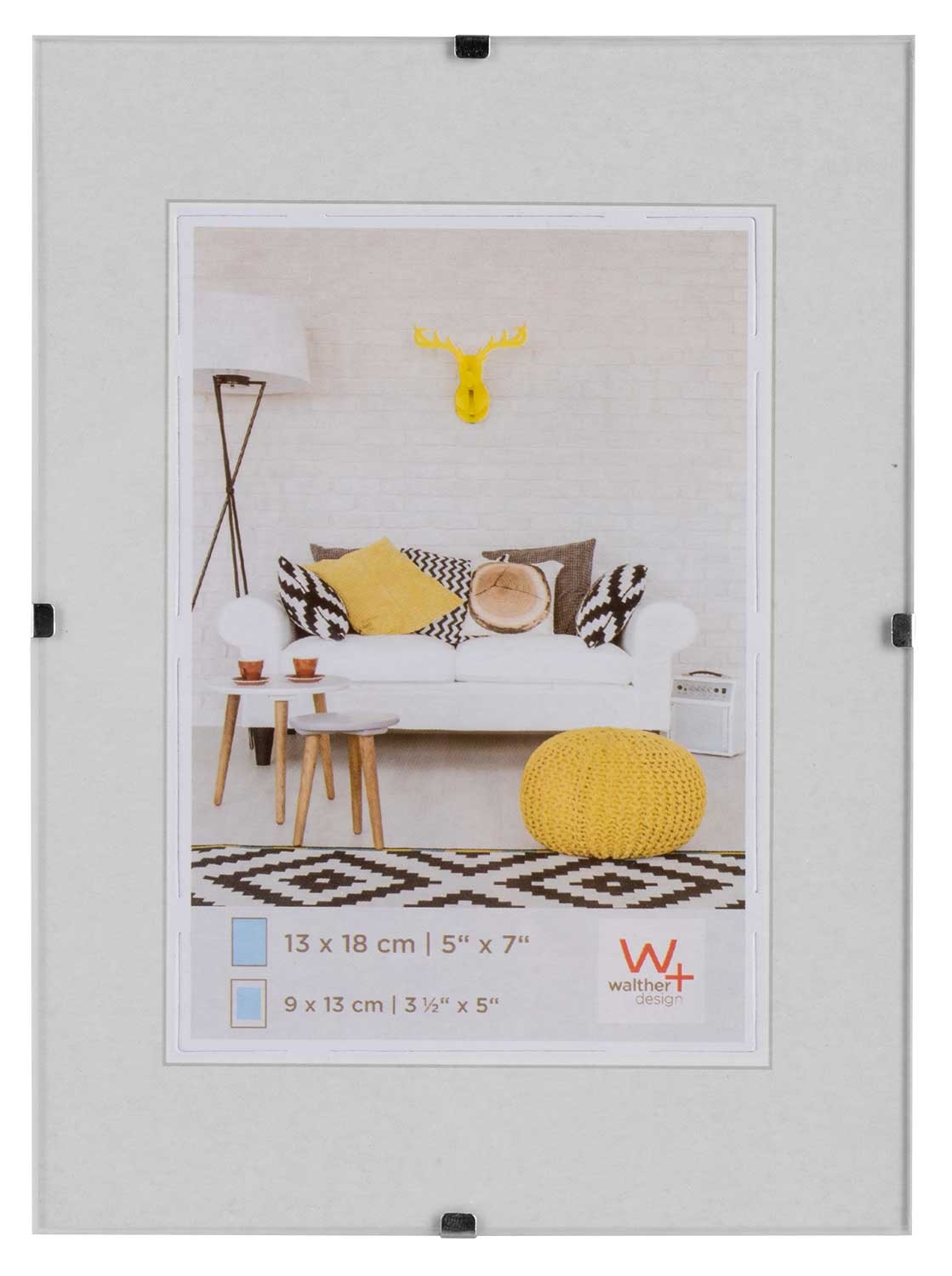 Der rahmenlose Bildhalter aus Klarglas hat eine Größe von 13 x 18 cm. Im Rahmen befindet sich ein Passepartout, passend für eine Bildgröße von 9 x 13 cm. Ohne Passepartout kann auch eine Bildgröße von 13 x 18 cm verwendet werden.