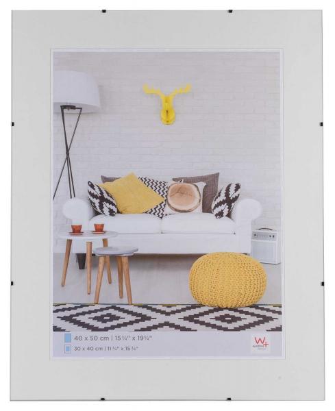 Der rahmenlose Bildhalter aus Klarglas hat eine Größe von 40 x 50 cm. Im Rahmen befindet sich ein Passepartout, passend für eine Bildgröße von 30 x 40 cm. Ohne Passepartout kann auch eine Bildgröße von 40 x 50 cm verwendet werden.