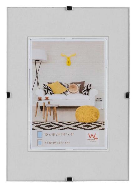 Der rahmenlose Bildhalter aus Klarglas hat eine Größe von 10 x 15 cm. Im Rahmen befindet sich ein Passepartout, passend für eine Bildgröße von 7 x 10 cm. Ohne Passepartout kann auch eine Bildgröße von 10 x 15 cm verwendet werden.