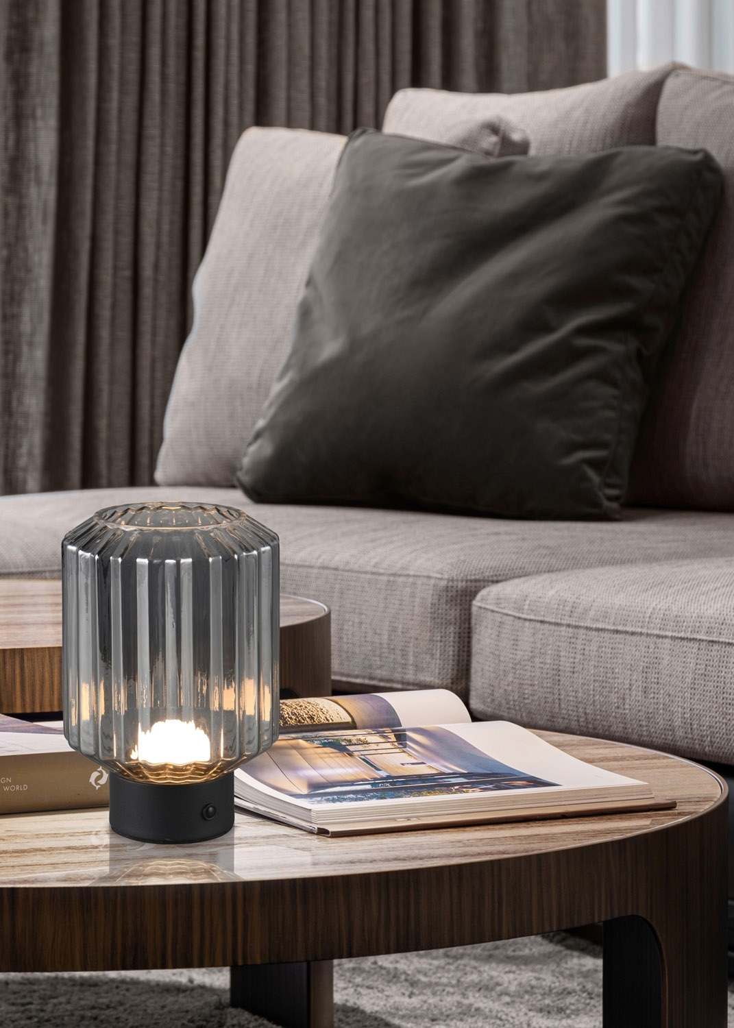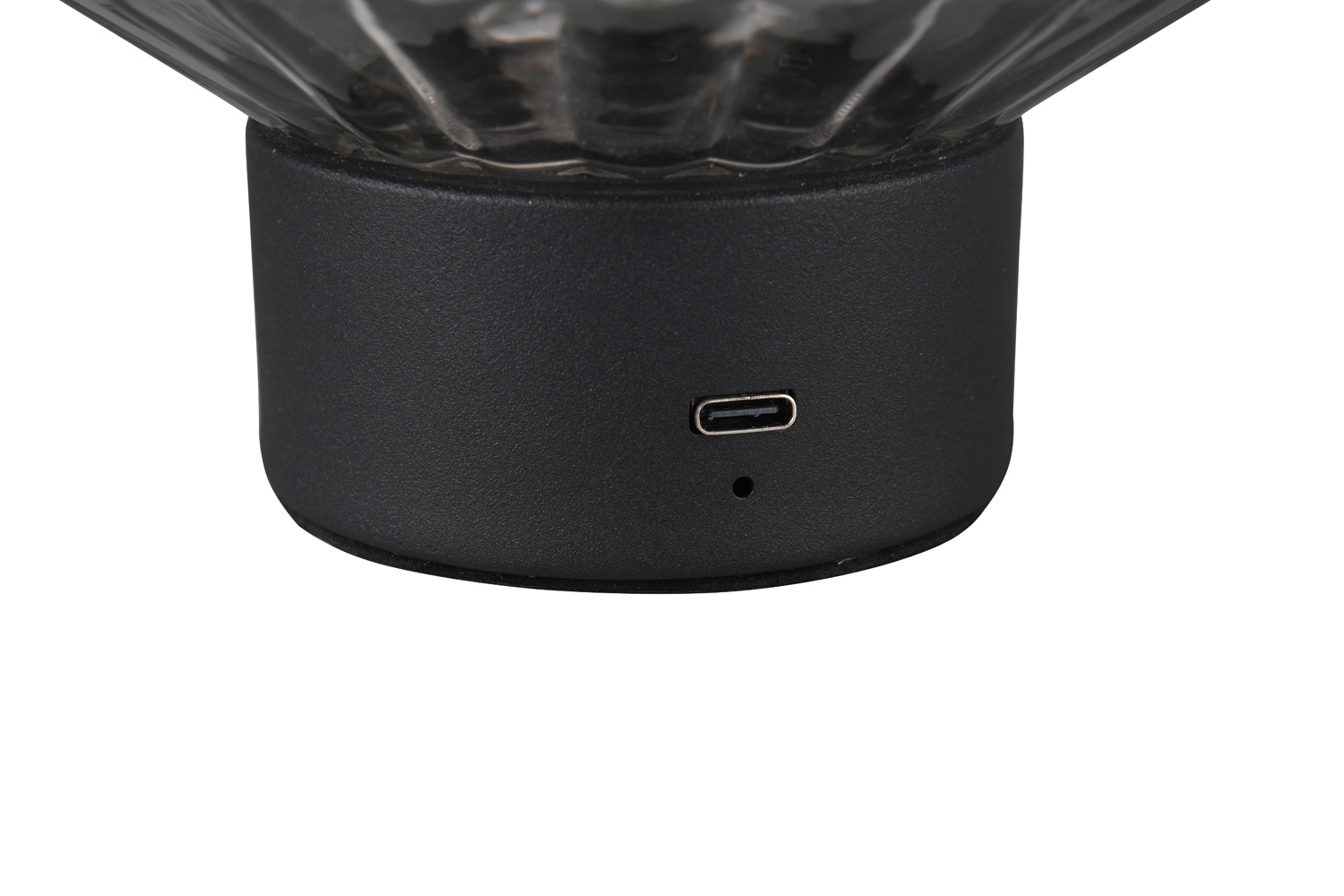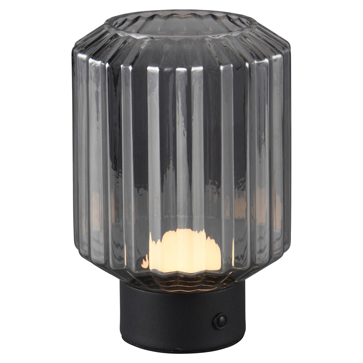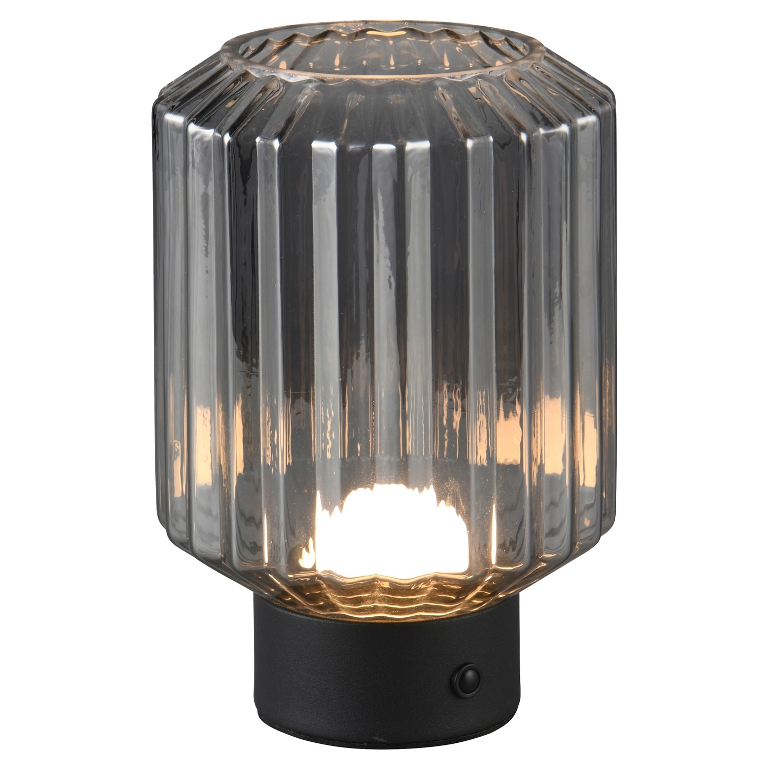 Die Akku LED-Tischlampe LORD von Reality Leuchten kombiniert elegantes Design mit praktischer Funktionalität. Hergestellt aus Metall in schwarz und einem Lampenschirm aus rauchfarbenem Glas strahlt sie zeitlose Eleganz aus. Der wiederaufladbare Akku mit USB-Port und mitgeliefertem Kabel ermöglicht kabellose Beleuchtung und einfaches Aufladen. Die Lampe ist 4-fach dimmbar und verfügt über einen Touchsensor für bequeme Helligkeitsanpassungen. Mit einem Durchmesser von 13 cm und einer Höhe von 19 cm passt sie perfekt auf jeden Tisch oder Nachttisch. Das enthaltene LED-Leuchtmittel bietet eine Leistung von 1,5 Watt, eine warmweiße Farbtemperatur von 3000 Kelvin und eine Helligkeit von 100 Lumen, was für eine angenehme Beleuchtung sorgt. Ob im Wohnzimmer oder Schlafzimmer, die Tischleuchte ist eine stilvolle und praktische Lichtquelle für verschiedene Anlässe.