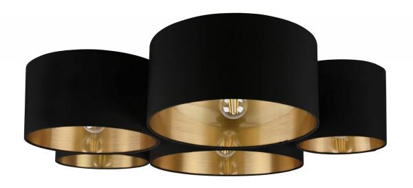 Die Deckenleuchte CARLTON von Reality Leuchten präsentiert sich in den Farben Schwarz und Goldgelb und verfügt über eine Breite von 90 cm. Die Höhe beträgt 21,5 cm und die Tiefe 70 cm. Das Gestell besteht aus Metall, während der Schirm aus Kunststoff, Metall und Stoff gefertigt ist, wobei der Stoffanteil zu 100 % aus Polyester besteht. Die Leuchte ist für 5 Leuchtmittel vom Typ E27 ausgelegt, die jedoch separat erworben werden müssen. Die maximale Leistung beträgt 47 Watt pro Leuchtmittel. Ein Schalter ist über den Wandschalter bedienbar.