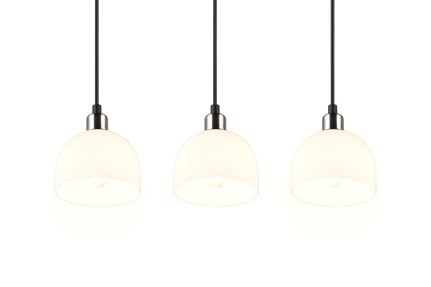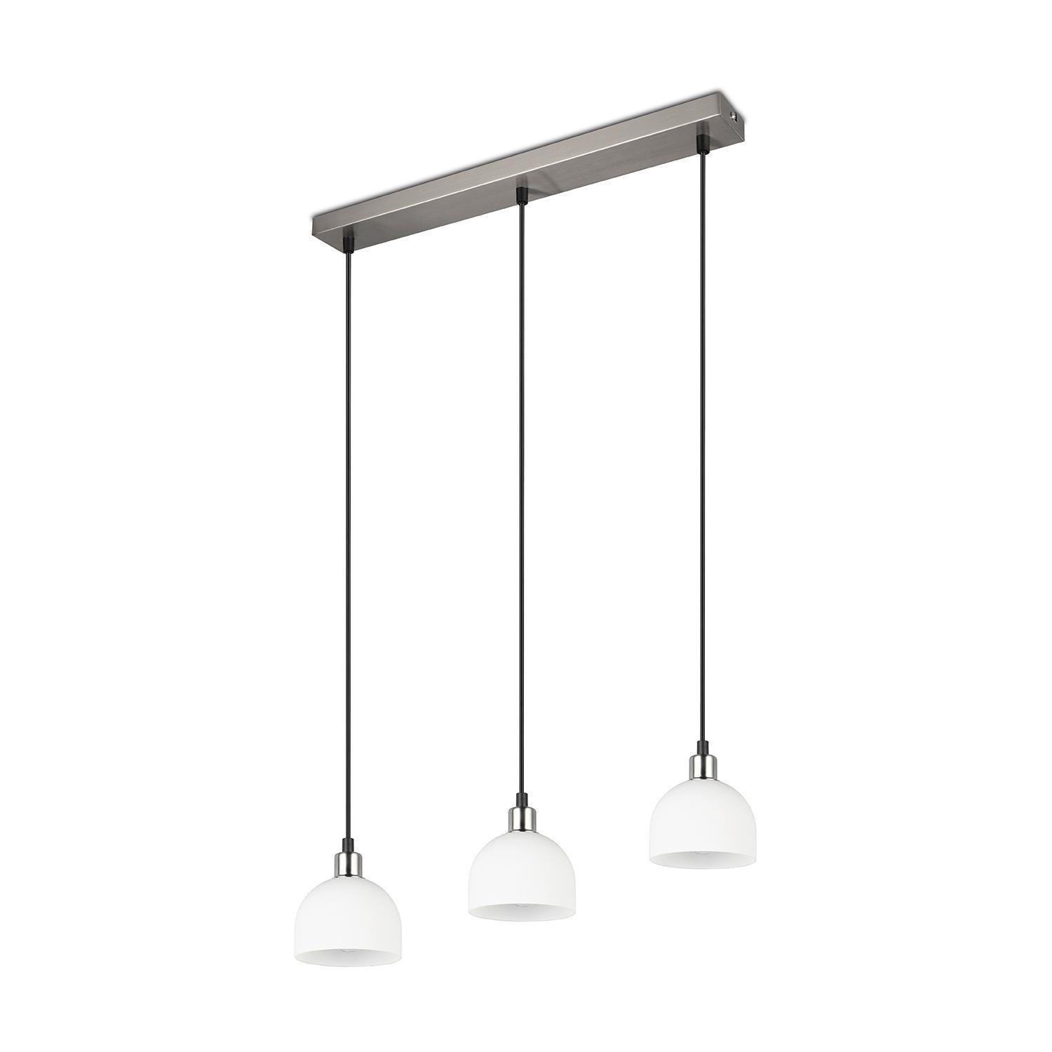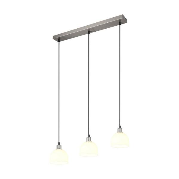 Die Pendelleuchte MOLLY von Reality Leuchten besteht aus nickelfarbenem Metall und weißen Glasschirmen. Die Lampenschirme sind in der Höhe verstellbar, sodass die Leuchte individuell angepasst werden kann. Sie ist für drei E14-Leuchtmittel geeignet, die mit einer maximalen Leistung von je 10 Watt betrieben werden können. Die Pendelleuchte hat eine Breite von 60 cm, eine Höhe von 150 cm und eine Tiefe von 12 cm. Die Leuchtmittel sind nicht im Lieferumfang enthalten, können jedoch problemlos ausgetauscht werden.