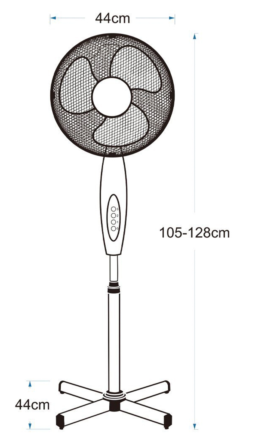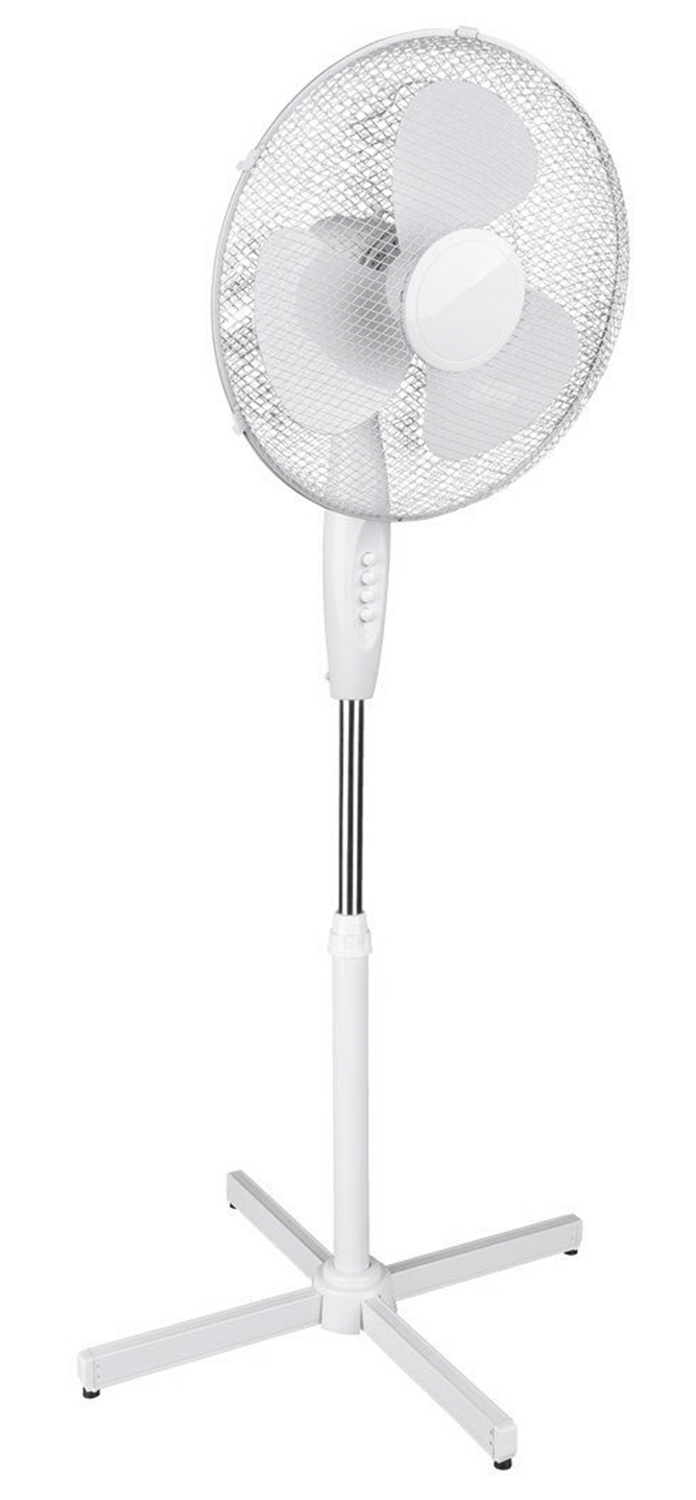 Der Standventilator verfügt über einen leistungsstarken 40 Watt Motor. Mit den 3 einstellbaren Geschwindigkeitsstufen können Sie die Luft vom kühlen Windhauch bis zur stärkeren Brise durch den Raum verteilen. Die integrierte Oszillationsfunktion, oder auch Schwenkautomatik, lässt das Gerät automatisch von 90° bis 180° schwenken. Das Gestell ist von 105 cm bis 128 cm in der Höhe verstellbar und der Ventilator ist in der Neigung kippbar.