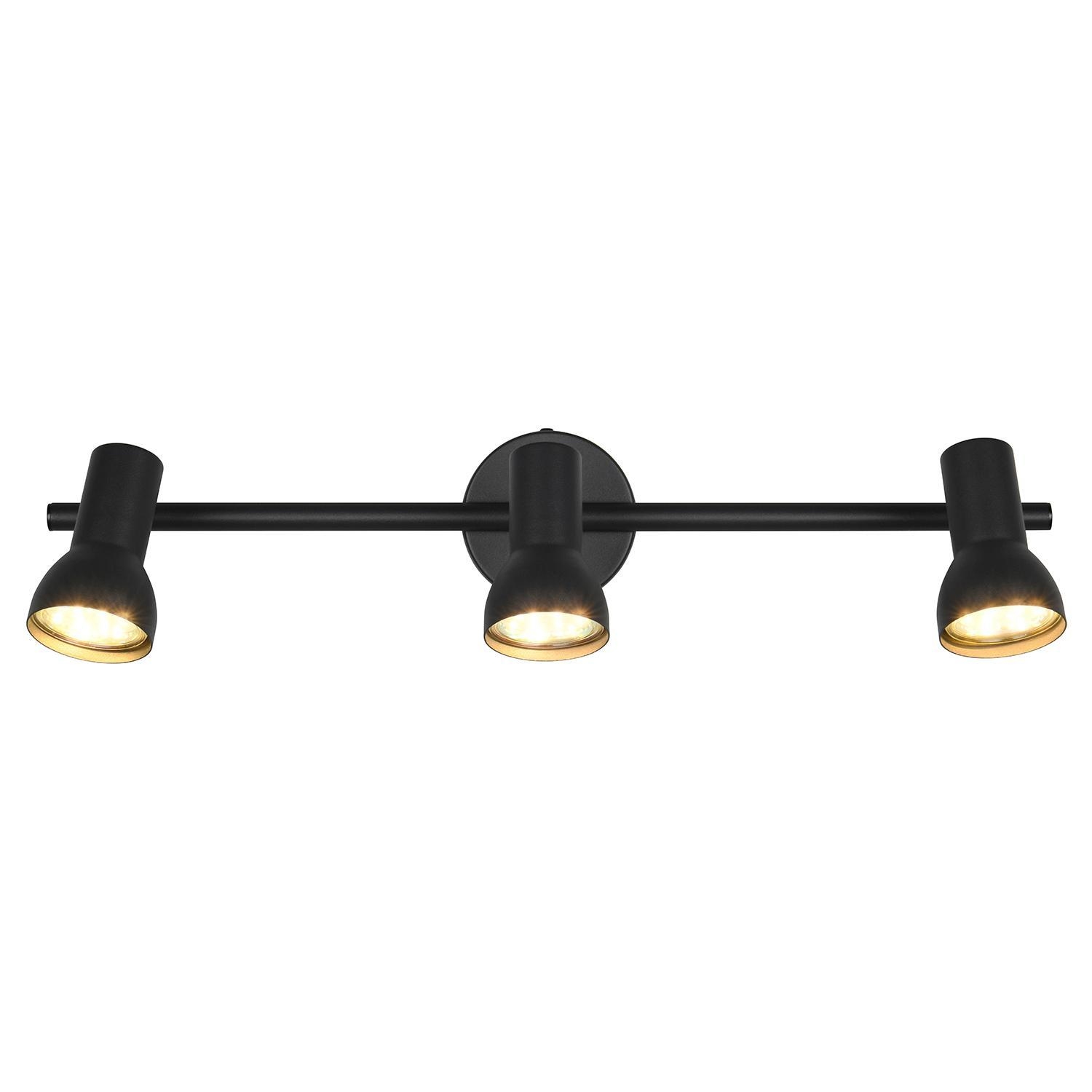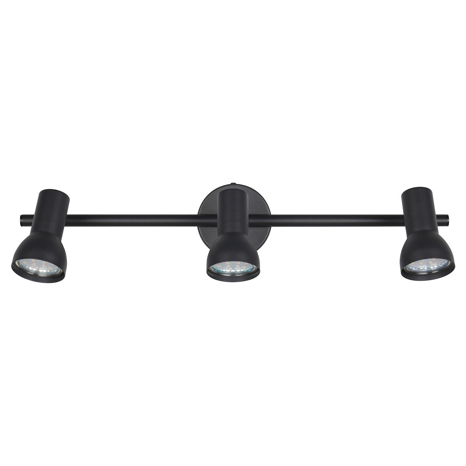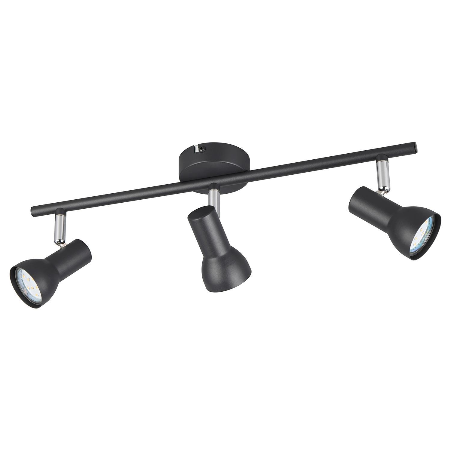 Der Strahler CANTAR der Marke Reality Leuchten ist aus Metall in der Farbe Schwarz gehalten. Die drei verstellbaren Lampenschirme ermöglichen eine flexible Ausrichtung des Lichts. Der Strahler verfügt über eine Breite von 45,5 cm, eine Höhe von 15,5 cm und eine Tiefe von 8 cm. Es sind drei Leuchtmittel erforderlich, die nicht im Lieferumfang enthalten sind. Die Leuchtmittel sind austauschbar und entsprechen dem Typ GU10. Die maximale Leistung pro Leuchtmittel beträgt bis zu 5 Watt.