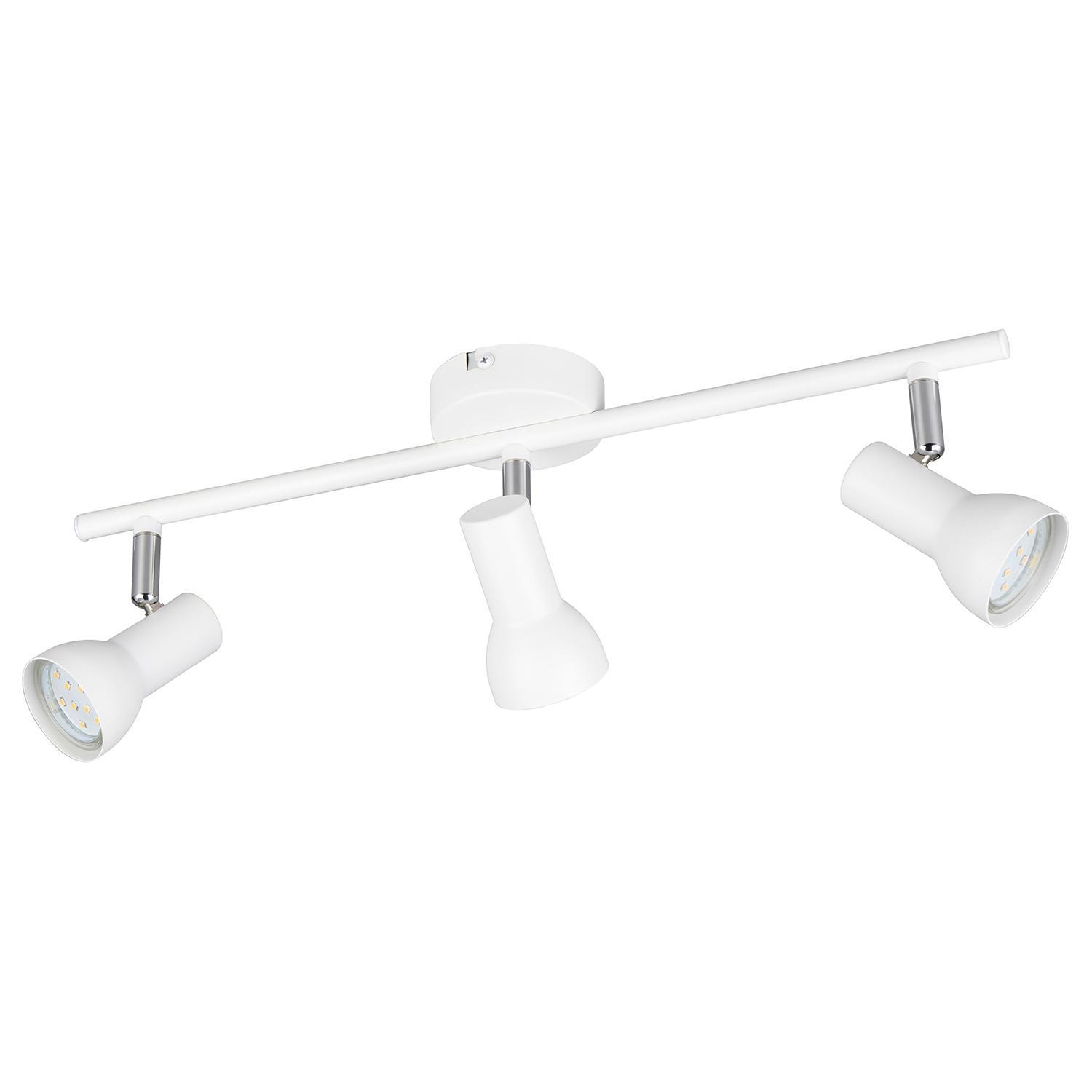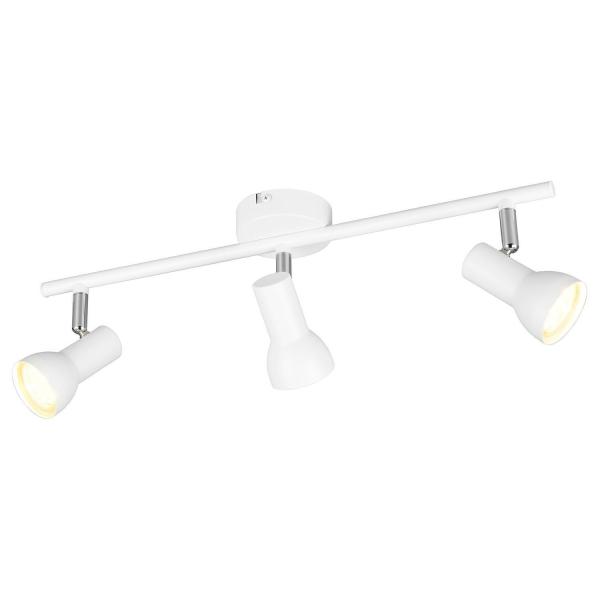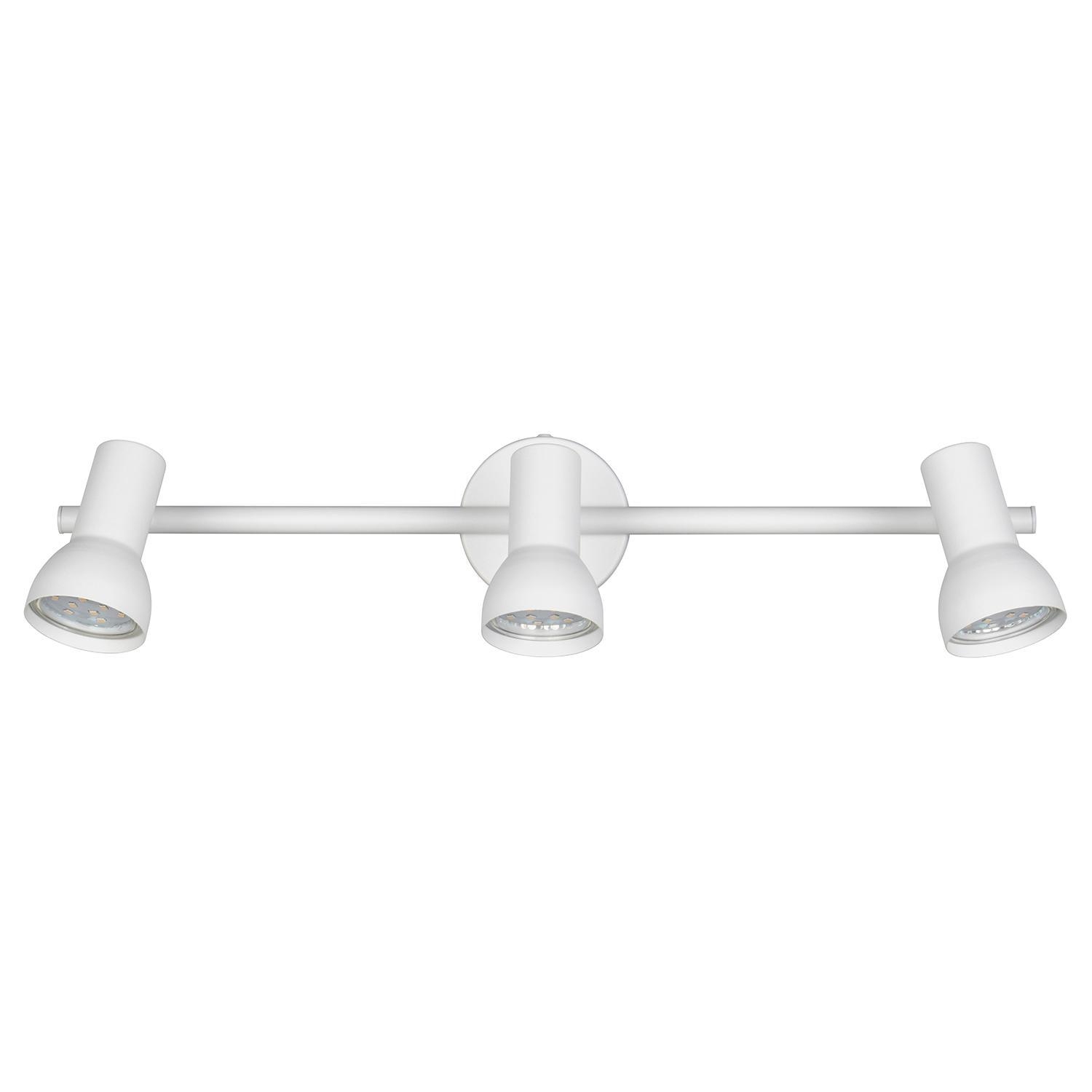 Der Strahler CANTAR der Marke Reality Leuchten ist aus Metall in der Farbe Weiß gehalten. Die drei verstellbaren Lampenschirme ermöglichen eine flexible Ausrichtung des Lichts. Der Strahler verfügt über eine Breite von 45,5 cm, eine Höhe von 15,5 cm und eine Tiefe von 8 cm. Es sind drei Leuchtmittel erforderlich, die nicht im Lieferumfang enthalten sind. Die Leuchtmittel sind austauschbar und entsprechen dem Typ GU10. Die maximale Leistung pro Leuchtmittel beträgt bis zu 5 Watt.