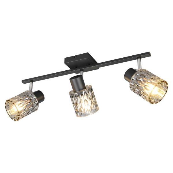 Der Strahler JACK der Marke Reality Leuchten besteht aus schwarzem Metall und ist mit drei verstellbaren Lampenschirmen aus rauchfarbenem Glas ausgestattet. Die Breite beträgt 55 cm, die Höhe 21 cm und die Tiefe 16 cm. Der Strahler ist für drei Leuchtmittel des Typs E27 mit einer Leistung von jeweils bis zu maximal 10 Watt geeignet. Die Leuchtmittel sind nicht im Lieferumfang enthalten, können jedoch ausgetauscht werden.