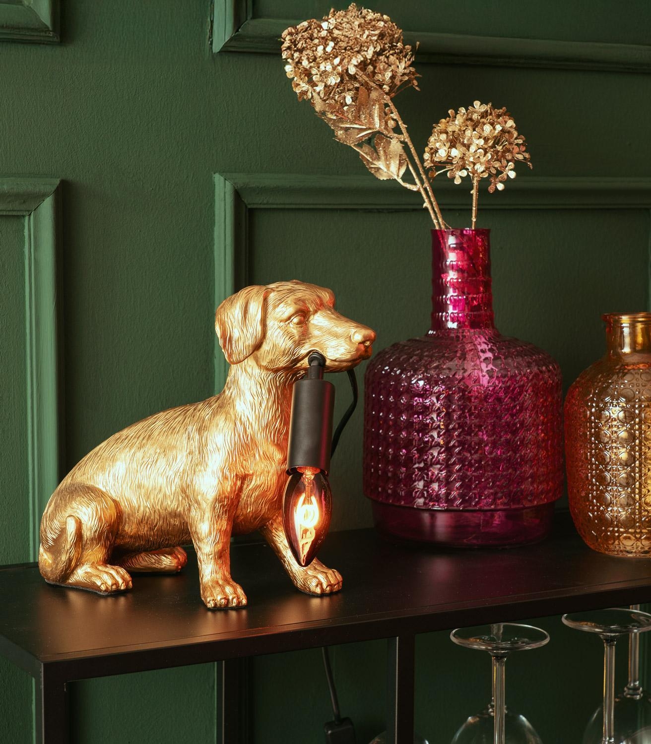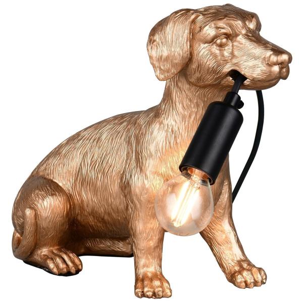 Die Tischlampe RUDI der Marke Reality Leuchten ist aus Kunststoff in Goldgelb gefertigt und in Form eines Dackels gestaltet. Sie verfügt über einen Schnurschalter zur Bedienung. Die Maße betragen 23,5 cm in der Breite, 28 cm in der Höhe und 13 cm in der Tiefe. Die Lampe ist für ein Leuchtmittel mit E14-Fassung ausgelegt, das nicht im Lieferumfang enthalten ist, aber austauschbar bleibt. Die maximale Leistung des Leuchtmittels beträgt 10 Watt.