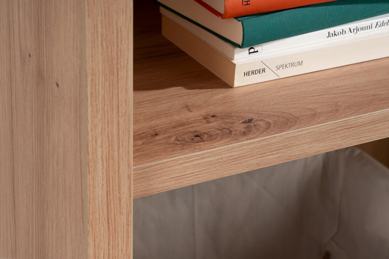 Das Regal DELA in Artisan Eichedekor ist 82 x 112 cm groß und bietet mit seinen 2 Einlegeböden und 3 offenen Fächern viel Stauraum für Bücher und Deko. Die warme Holzoptik fügt sich harmonisch in jeden Wohnraum ein. Hergestellt aus Holzwerkstoff, ist das Regal robust und langlebig. Es wird platzsparend flach verpackt geliefert und ist ideal zur Gestaltung offener, moderner Wohnbereiche.