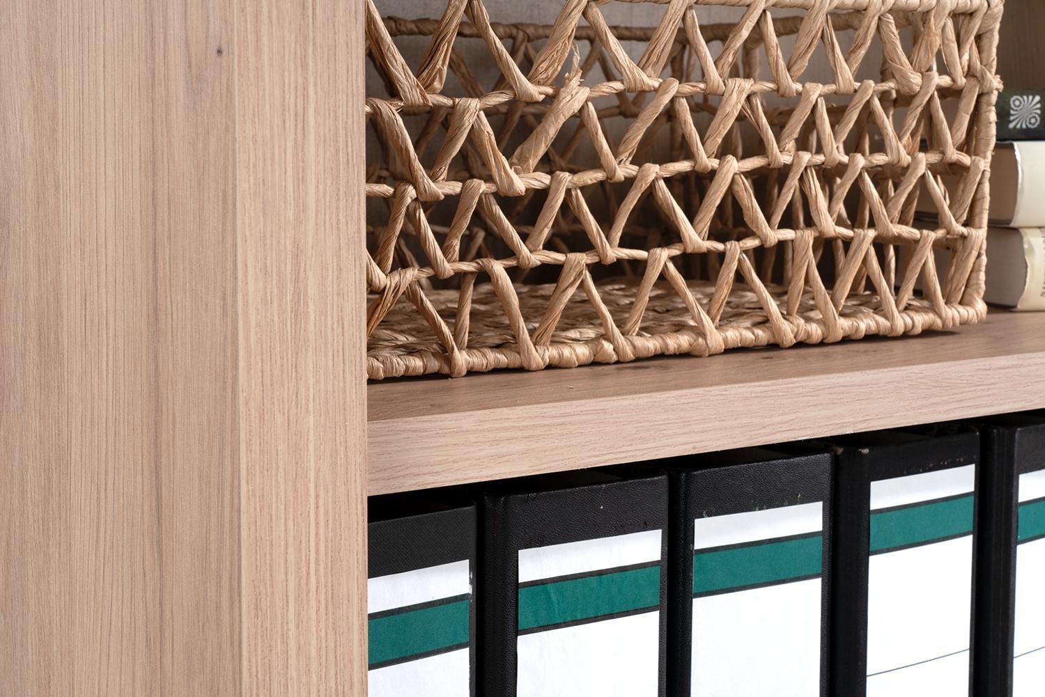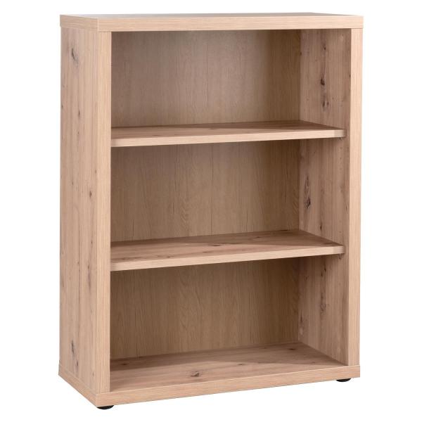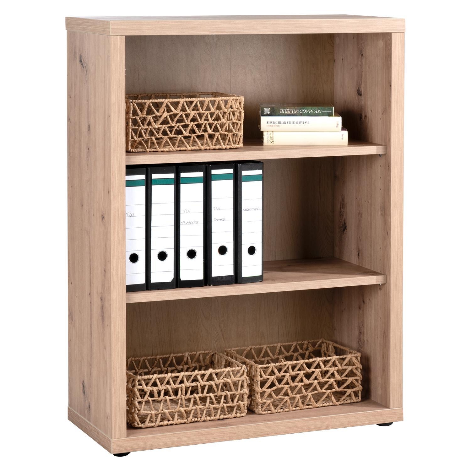 Das Regal REGINE ist in Artisan Eiche Dekor ausgeführt. Es bietet drei offene Fächer, die durch zwei höhenverstellbare Einlegeböden gegliedert sind. Die höhenverstellbaren Böden sind jeweils bis maximal 10 kg belastbar. Die Fächer sind auf die Aufbewahrung von handelsüblichen Ordnern ausgelegt. Das Regal hat eine Breite 82 cm, eine Höhe von 110 cm und eine Tiefe von 36 cm.