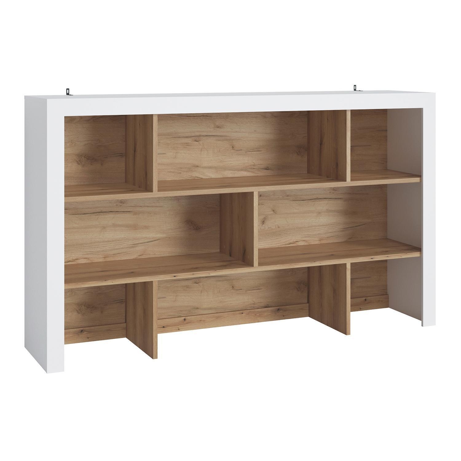 Der Schrankaufsatz CLARA ist in Alpinweiß gehalten und mit Absetzungen in Evoke Eiche Dekor versehen. Er verfügt über acht Ablagefächer und dient zur Erweiterung passender Sideboards. Für die sichere Nutzung ist eine zusätzliche Wandmontage erforderlich. Die Maße betragen 201 cm in der Breite, 119 cm in der Höhe und 45 cm in der Tiefe.