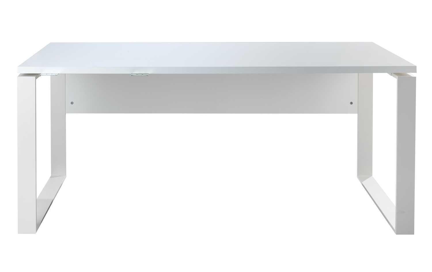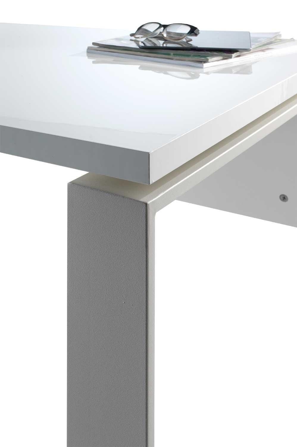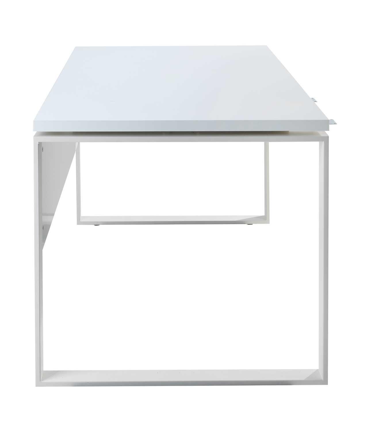 Der Schreibtisch DELA ist in Weiß gehalten und hat eine Breite von 170 cm, eine Höhe von 75 cm und eine Tiefe von 80 cm. Die Tischplatte ist in Weiß Hochglanz und das Gestell in weiß lackiertem Metall ausgeführt. Der Schreibtisch bietet ausreichend Ablagefläche und ist für den Einsatz im Büro oder Homeoffice geeignet.