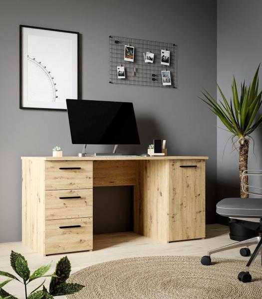 Der Schreibtisch NAOMI ist in Artisan Eiche Dekor ausgeführt und verfügt über drei nicht abschließbare Schubladen sowie eine Tür. Hinter der Tür befindet sich ein mehrfach höhenverstellbarer Einlegeboden. Die Maße des Schreibtischs betragen 138 cm in der Breite, 75 cm in der Höhe und 60 cm in der Tiefe.
