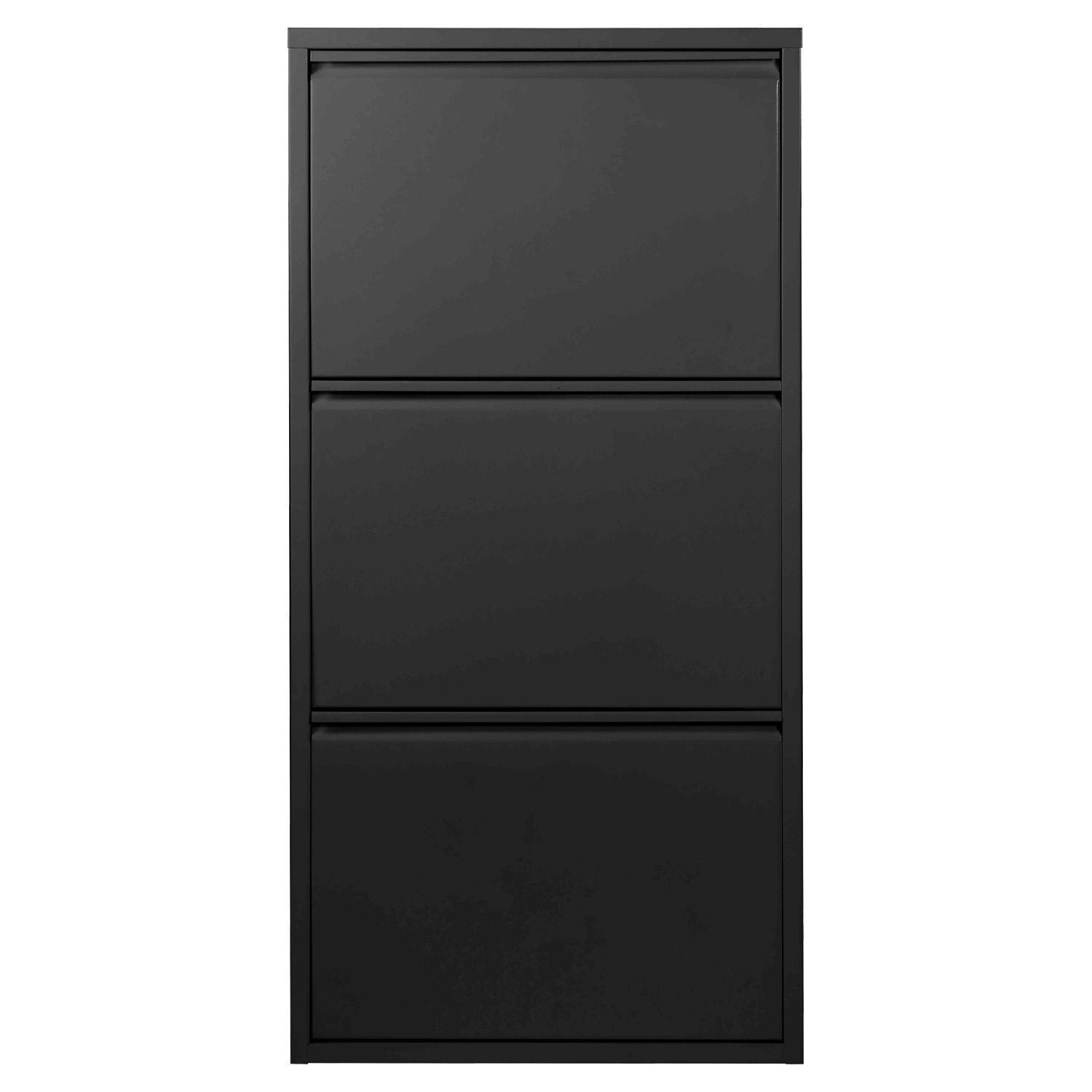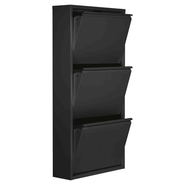 Der Schuhkipper SHADY überzeugt mit seinem schlichten Design in Schwarz matt und bietet eine platzsparende Lösung für die Schuhaufbewahrung. Gefertigt aus Metall, ist er langlebig und stabil. Mit drei einzeln zu öffnenden Klappen sorgt er für Übersichtlichkeit und einfachen Zugriff auf die Schuhe. Mit einer Breite von 50 cm, einer Höhe von 105 cm und einer Tiefe von nur 15 cm passt der Schuhkipper ideal in schmale Flure oder kleinere Räume – eine praktische Ergänzung für jedes Zuhause.