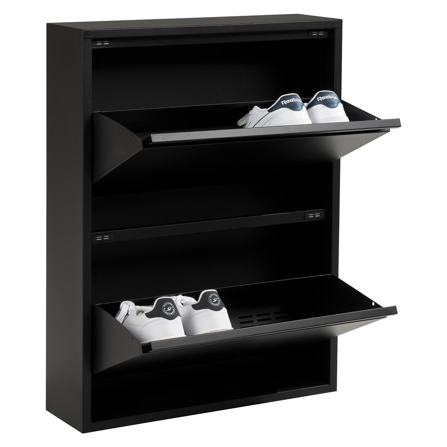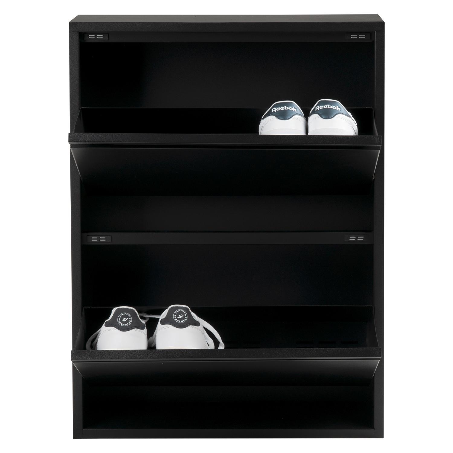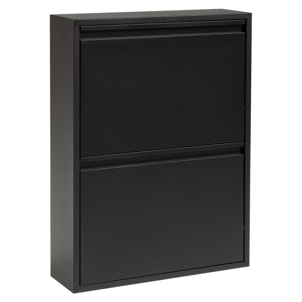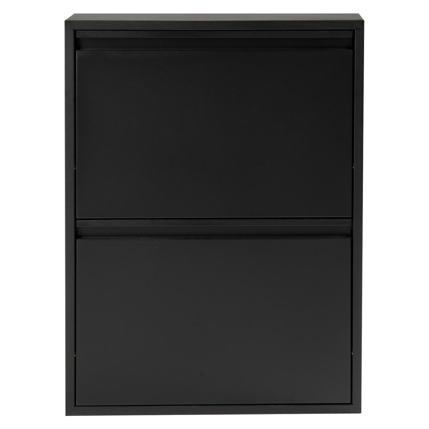 Der Schuhkipper SHADY überzeugt mit seinem schlichten Design in Schwarz matt und bietet eine platzsparende Lösung für die Schuhaufbewahrung. Gefertigt aus Metall, ist er langlebig und stabil. Mit zwei einzeln zu öffnenden Klappen sorgt er für Übersichtlichkeit und einfachen Zugriff auf die Schuhe. Mit einer Breite von 50 cm, einer Höhe von 72 cm und einer Tiefe von nur 15 cm passt der Schuhkipper ideal in schmale Flure oder kleinere Räume – eine praktische Ergänzung für jedes Zuhause.
